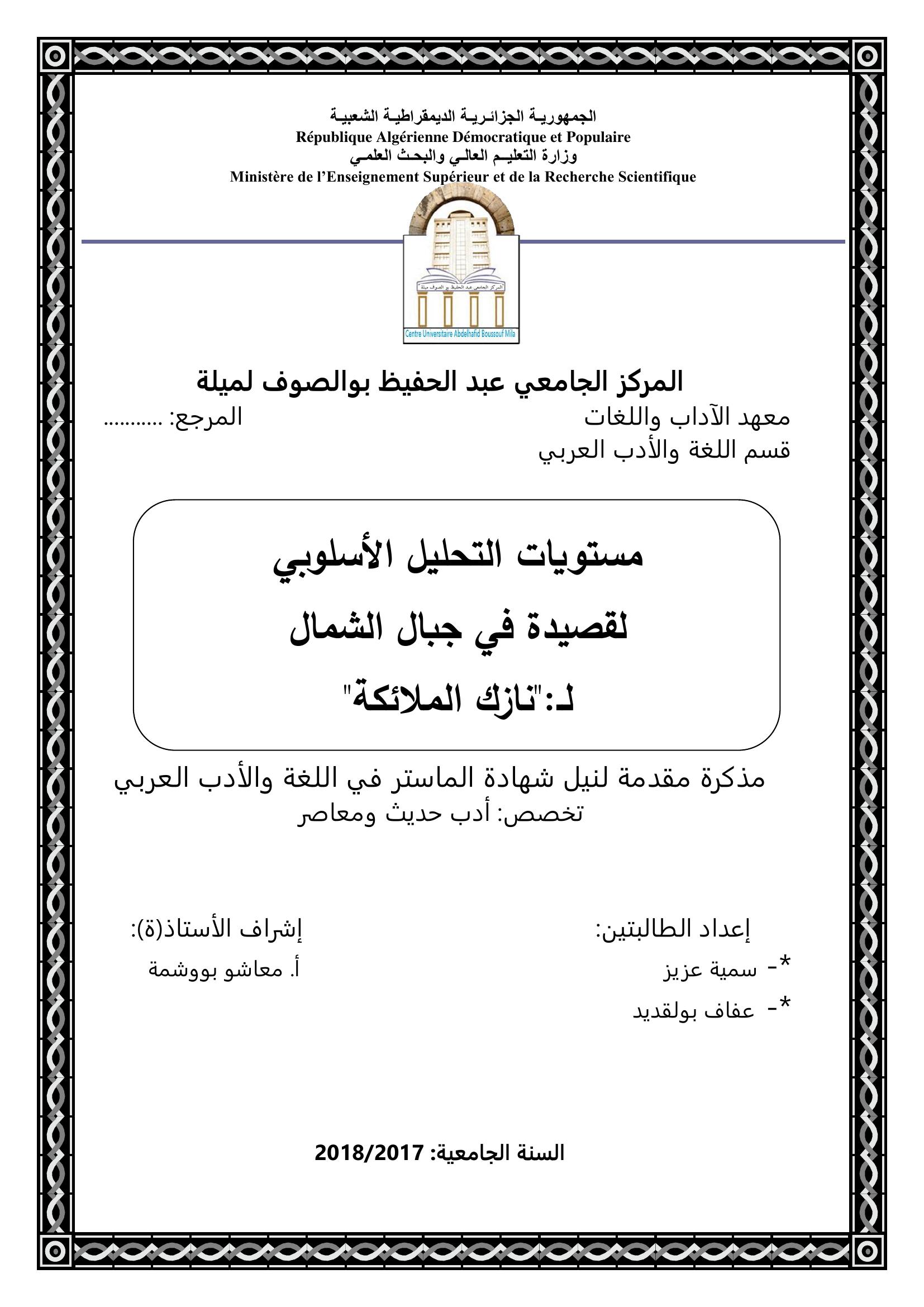 عزيز سمية & معاشوبووشمة (مشرفا) (2018). مستويات التحليل الأسلوبي لقصيدة في جبال الشمال لـ نازك الملائكة.