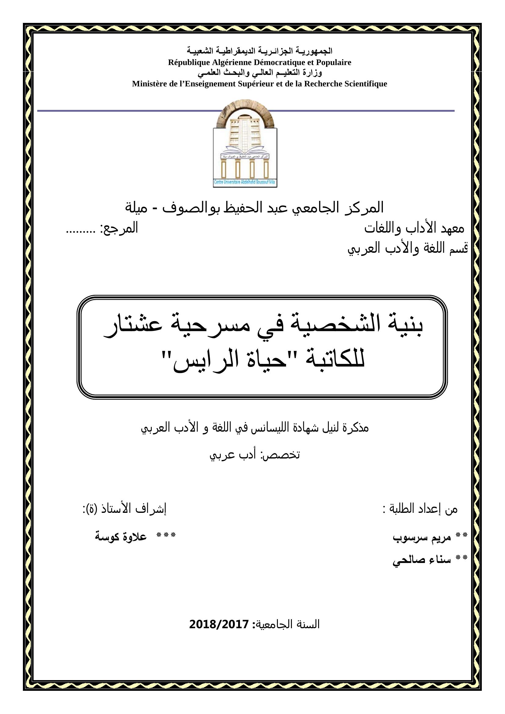 مريم سرسوب & علاوة كوسة(مشرفا) (2018). بنية الشخصية في مسرحية عشتار للكاتبة "حياة الرايس".