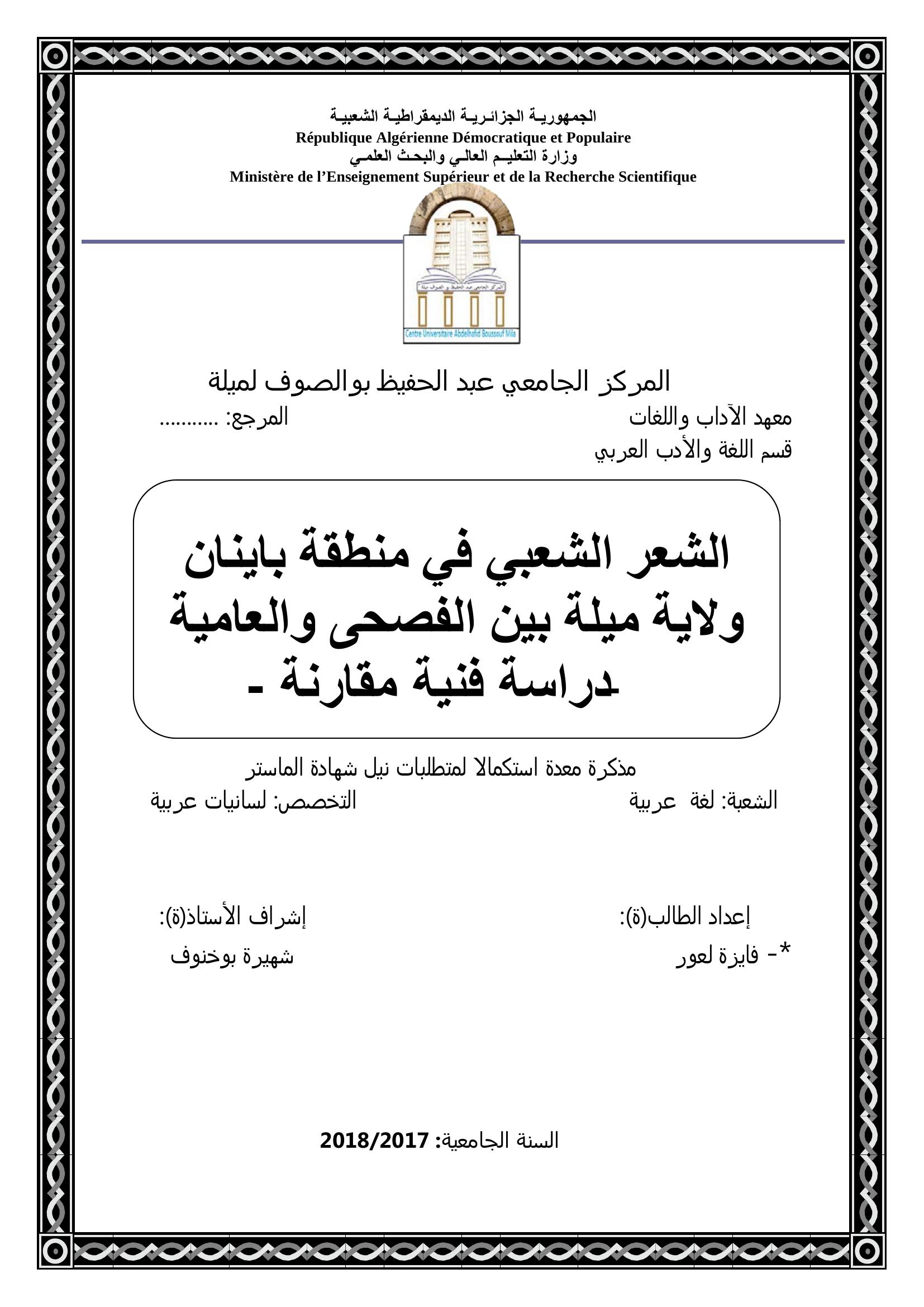 لعور فايزة & بوخنوف شهيرة (مشرفا) (2018). الشعر الشعبي في منطقة باينان ولاية ميلة بين الفصحى والعامية دراسة فنية مقارنة.