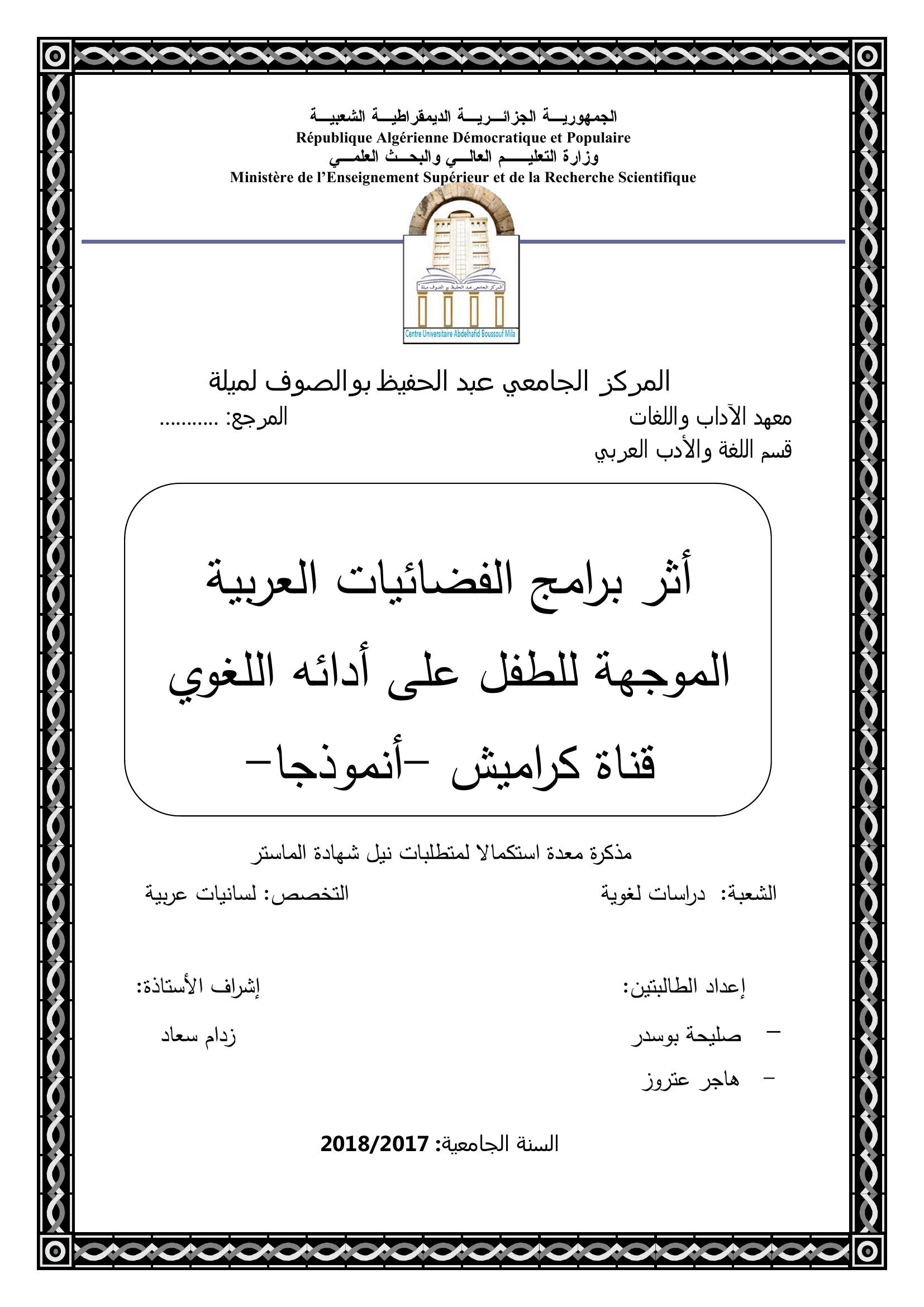 بوسدر صليحة & زدام سعاد (مشرفا) (2018). أثر برامج الفضائيات العربية الموجهة للطفل على آدائه اللغوي قناة كراميش أنموذجا.