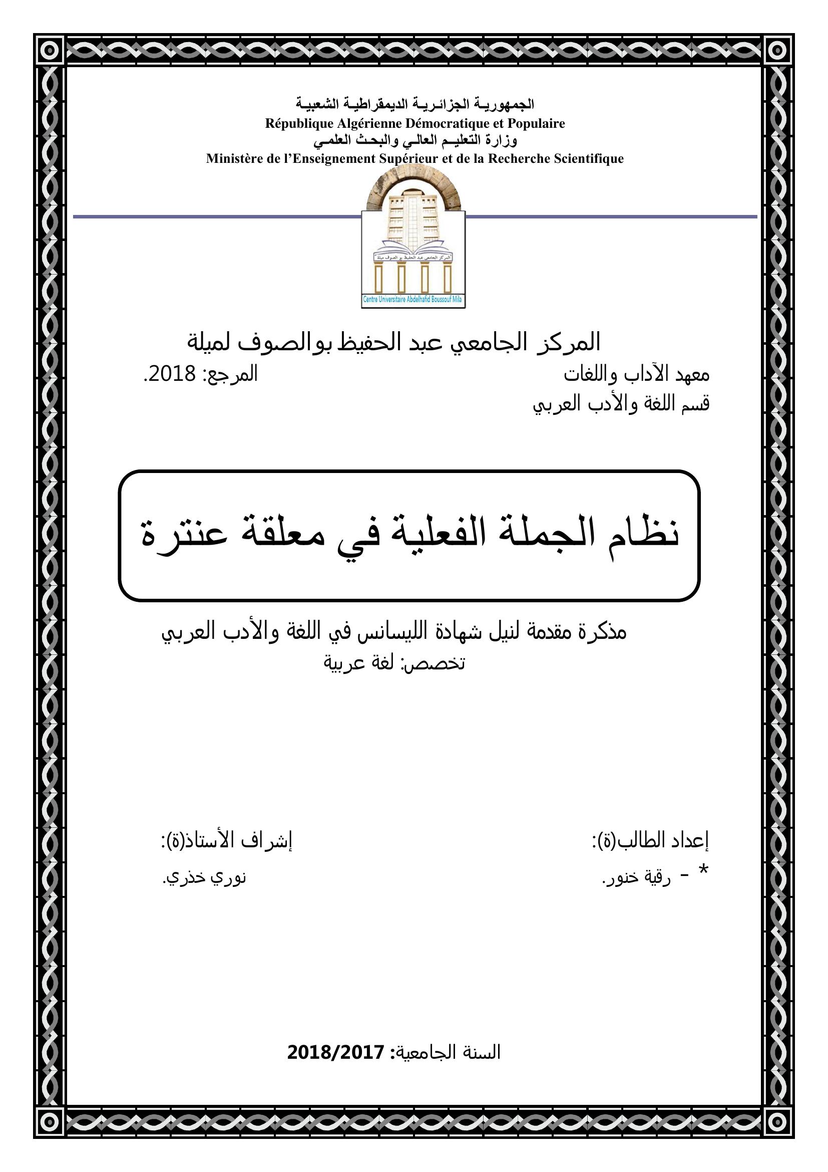 رقية خنور & نوري خذري(مشرفا) (2018). نظام الجملة الفعلية في معلقة عنترة.