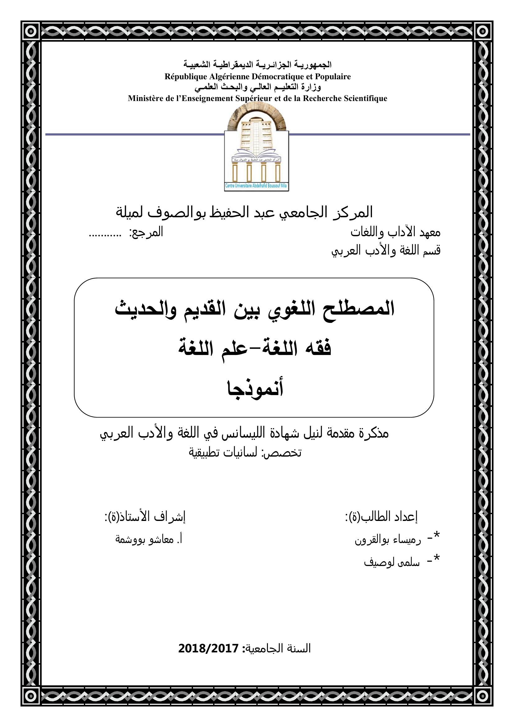 رميساء بوالقرون & معاشو بووشمة(مشرفا) (2018). المصطلح اللغوي بين القديم والحديث : فقه اللغة-علم اللغة أنموذجا.