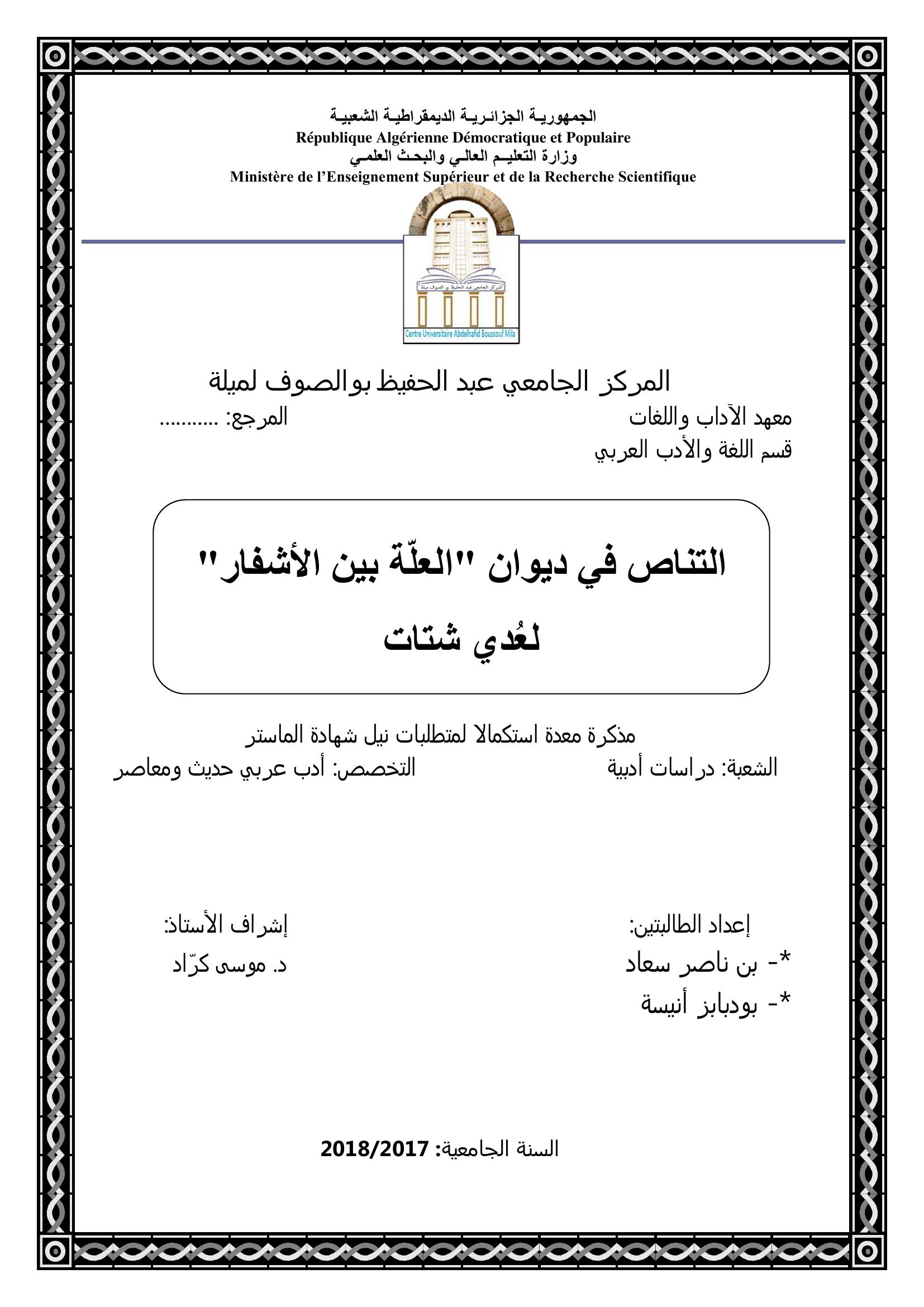 بن ناصر سعاد & كراد موسى (مشرفا) (2018). التناص في ديوان العلة بين الأشفار لغدي شتات.