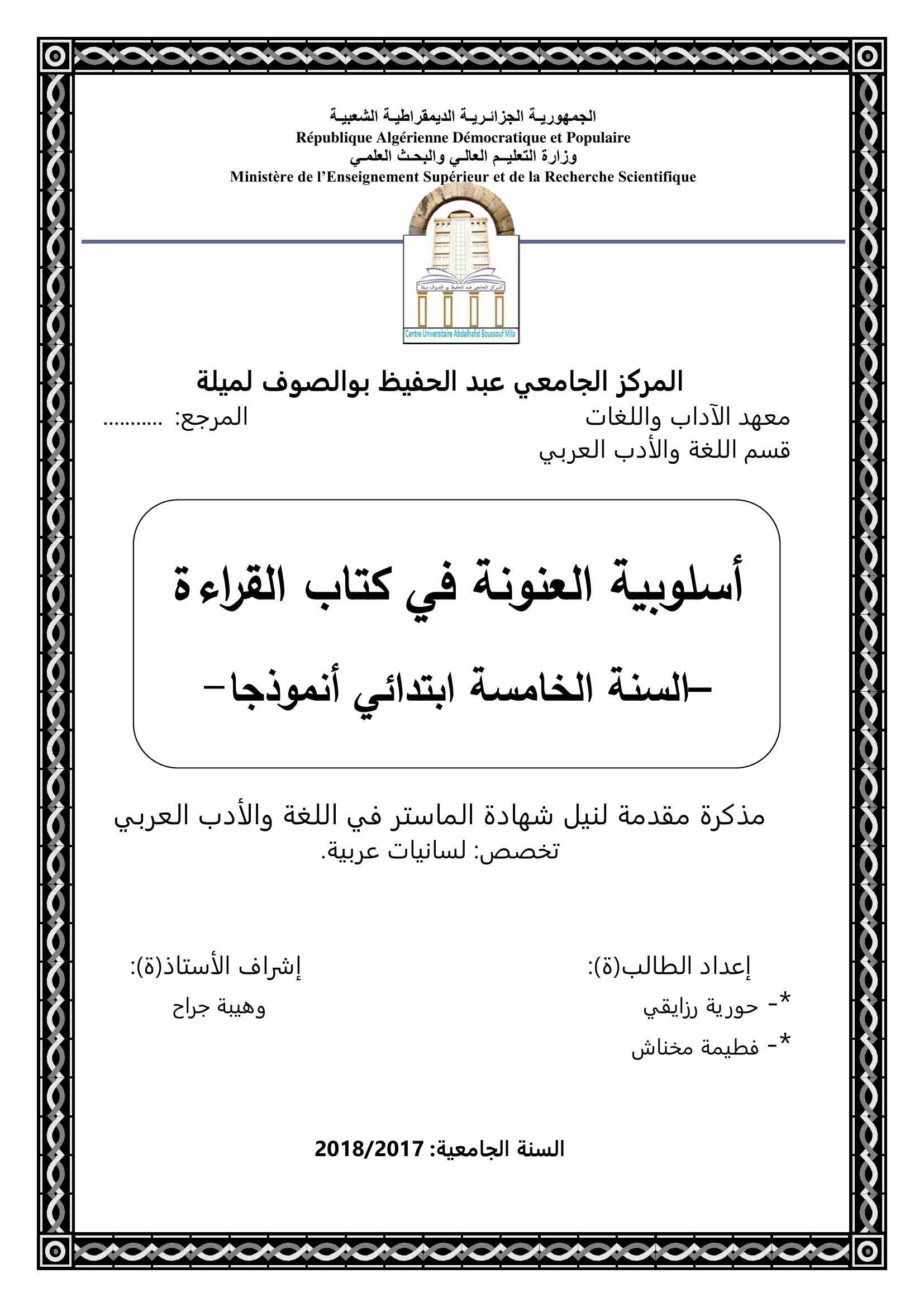 رزايقي حورية & جراح وهيبة (مشرفا) (2018). أسلوبية العنونة في كتاب القراءة السنة الخامسة إبتدائي أنموذجا.