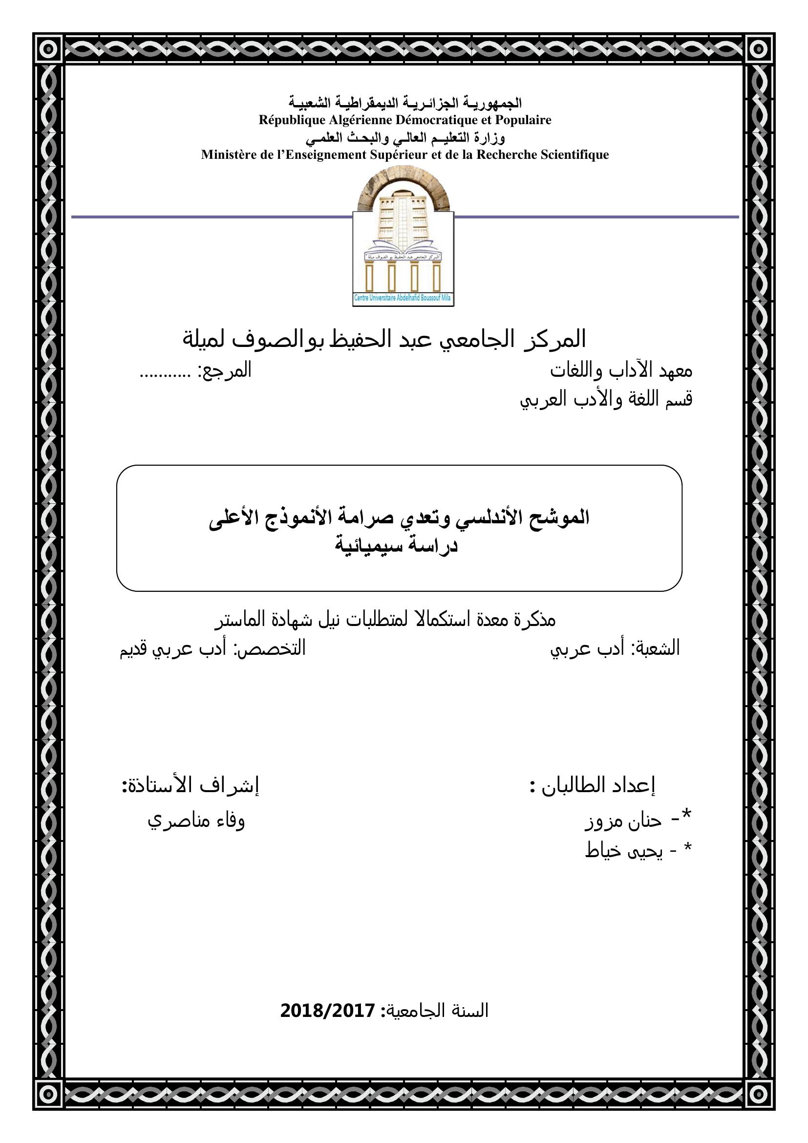 مزوز حنان & مناصري وفاء (مشرفا) (2018). الموشح الأندلسي وتعدي صرامة الأنموذج الأعلى دراسة سيميائية.