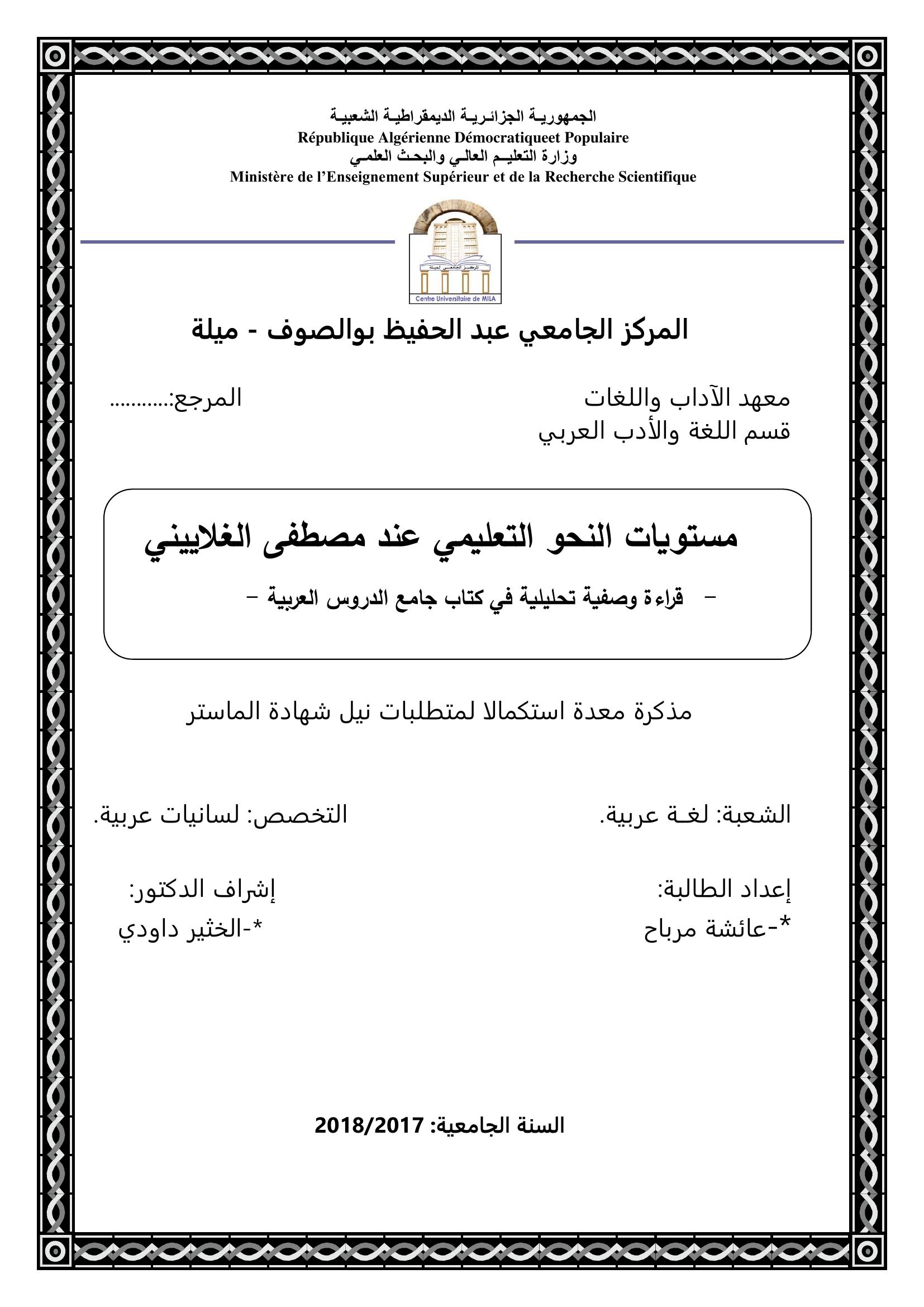 مرباح عائشة & داودي الخثير (مشرفا) (2018). مستويات النحو التعليمي عند مصطفى الغلاييني قراءة وصفية تحليلية في كتاب جامع الدروس العربية.