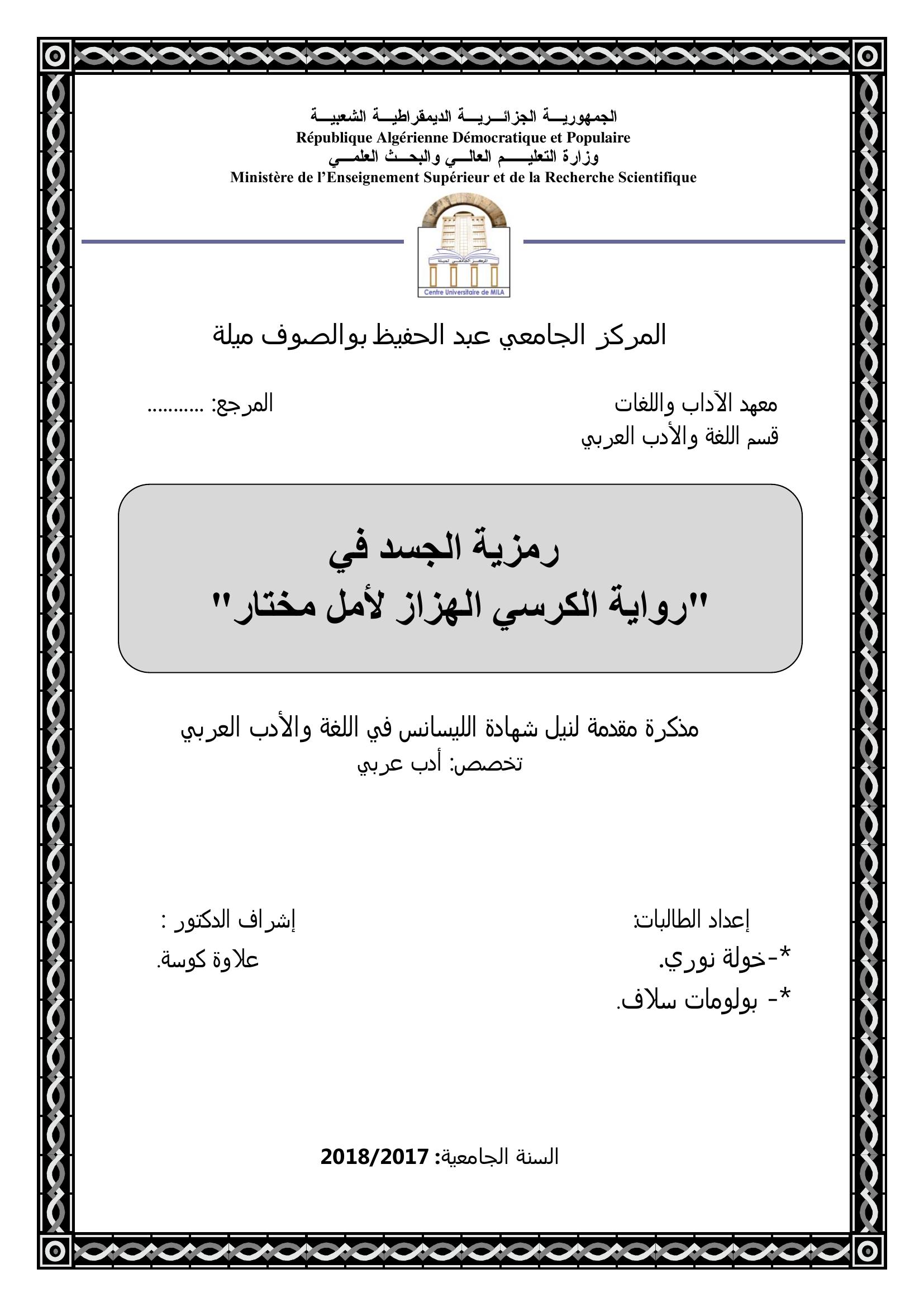 خولة نوري & علاوة كوسة(مشرفا) (2017). رمزية الجسذ في "رواية الكرسي الهزاز لأمل مختار".
