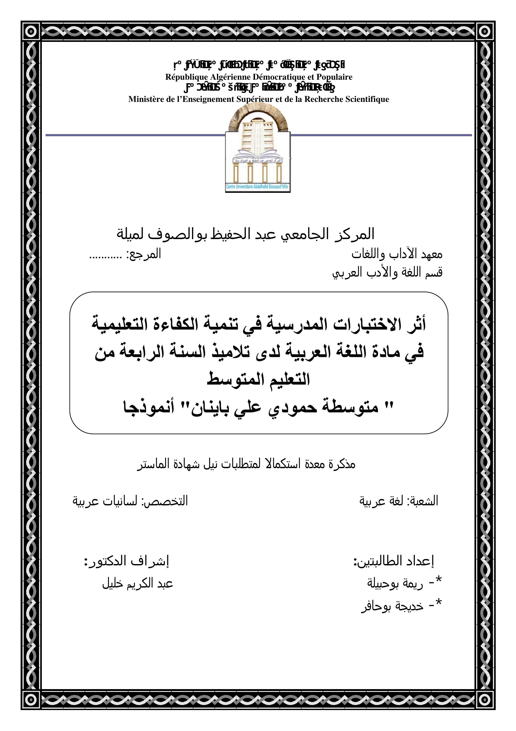 أثر الإختبارات المدرسية في تنمية الكفاءة التعليمية في مادة اللغة العربية لدى تلاميذ السنة الرابعة من التعليم المتوسط حمودي علي باينان أنموذجا