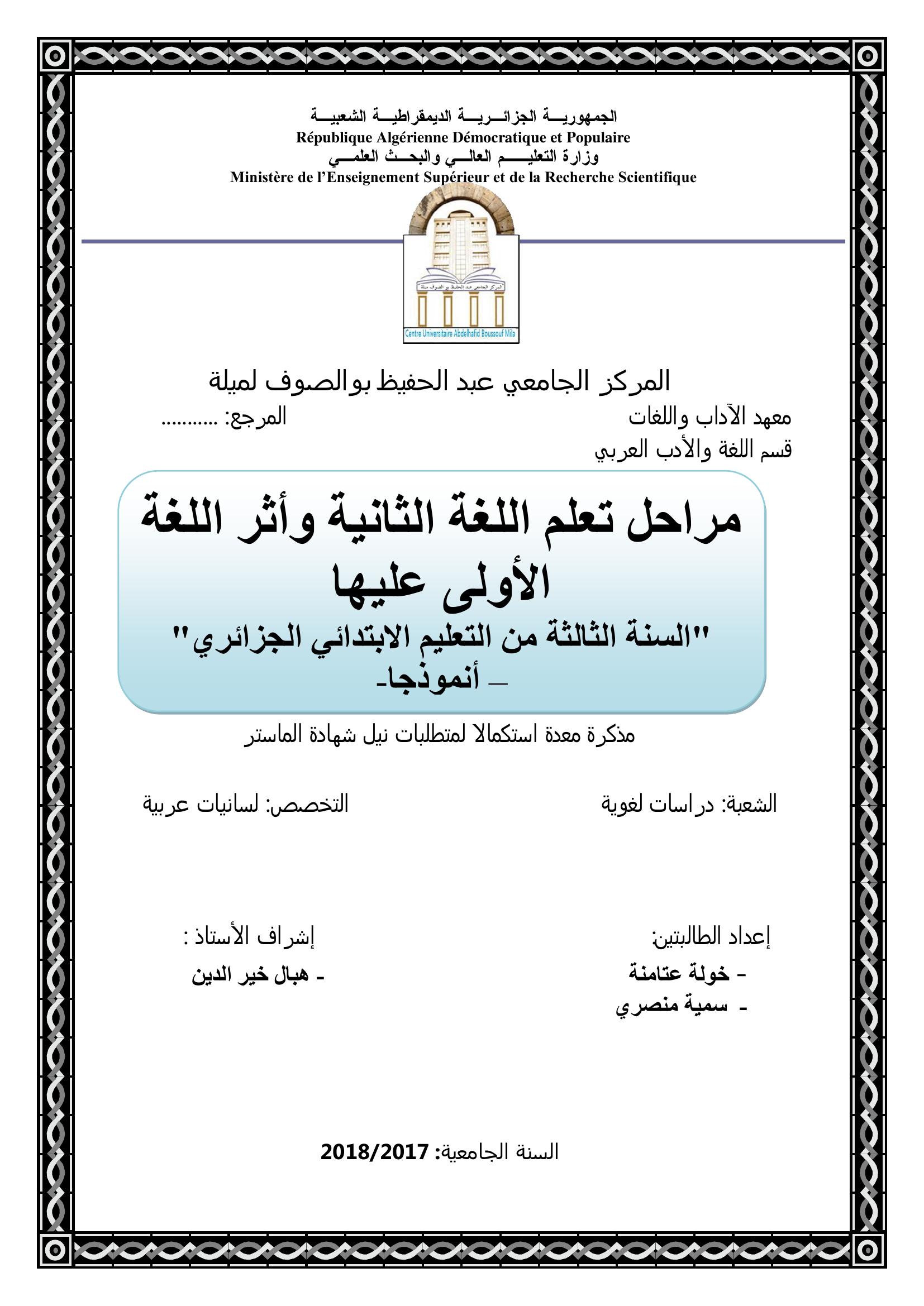 عتامنة خولة & هبال خير الدين (مشرفا) (2018). مراحل تعلم اللغة الثانية وأثر اللغة الأولى عليها السنة الثالثة من التعليم الإبتدائي الجزائري أنموذجا.