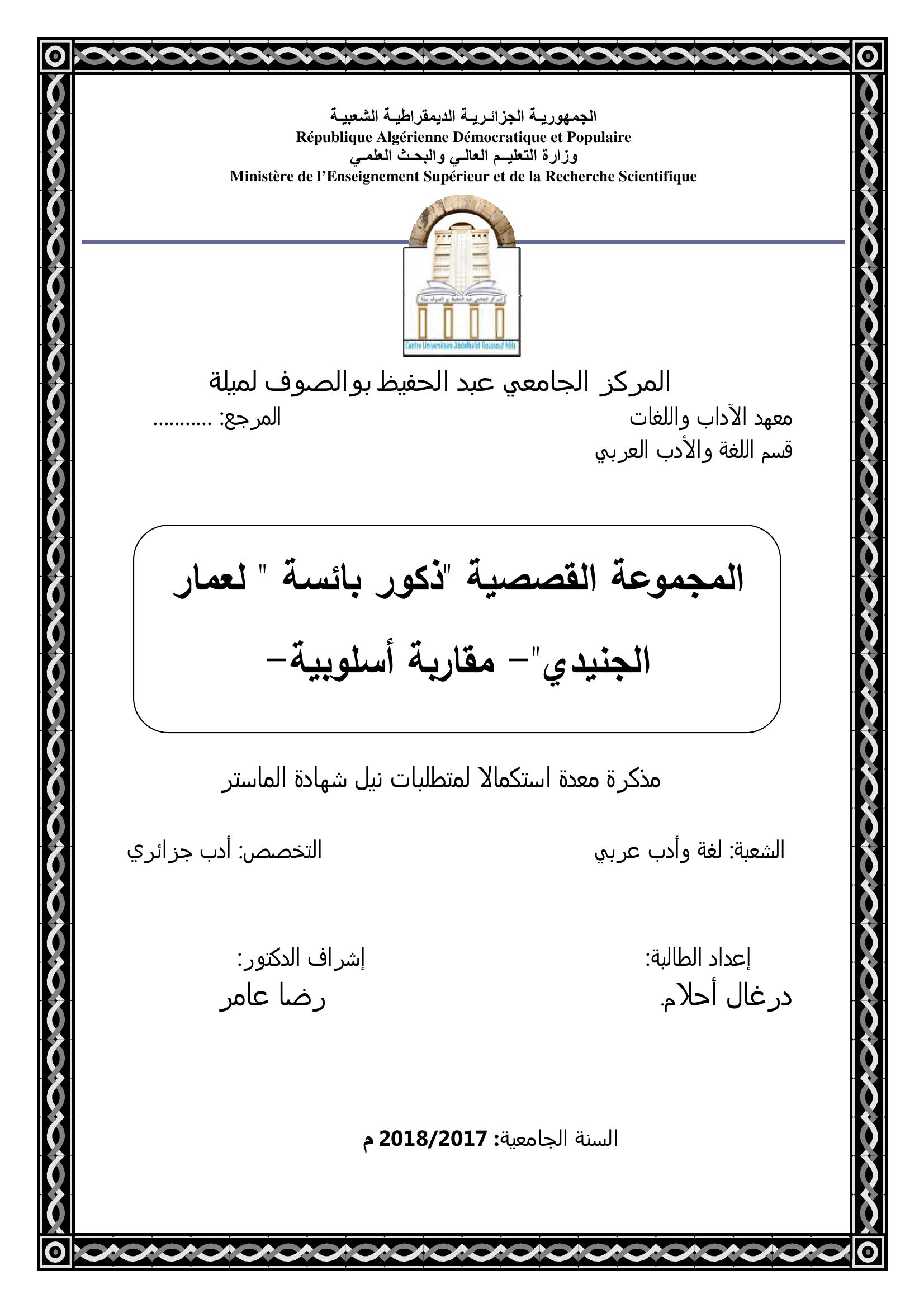 درغال أحلام & رضا عامر (مشرفا) (2018). المجموعة القصصية ذكور بائسة لعمار الجنيدي مقاربة أسلوبية.