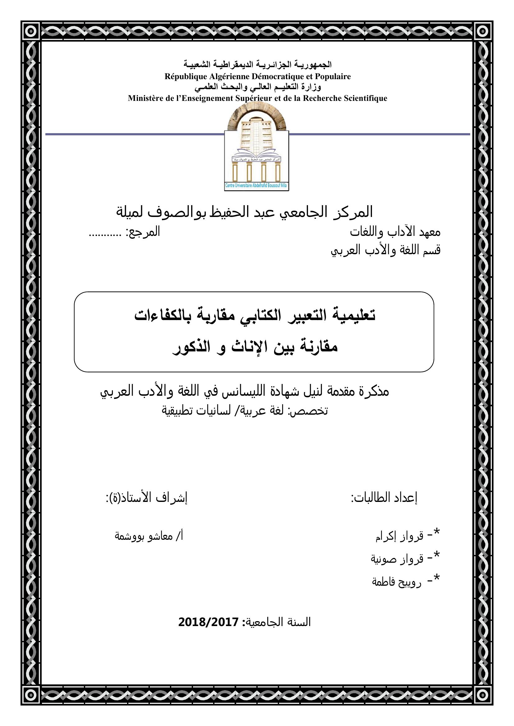 قرواز إكرام & معاشو بووشمة(مشرفا) (2018). تعليمية التعبير الكتابي مقاربة بالكفاءات : مقارنة بين الإناث و الذكور.