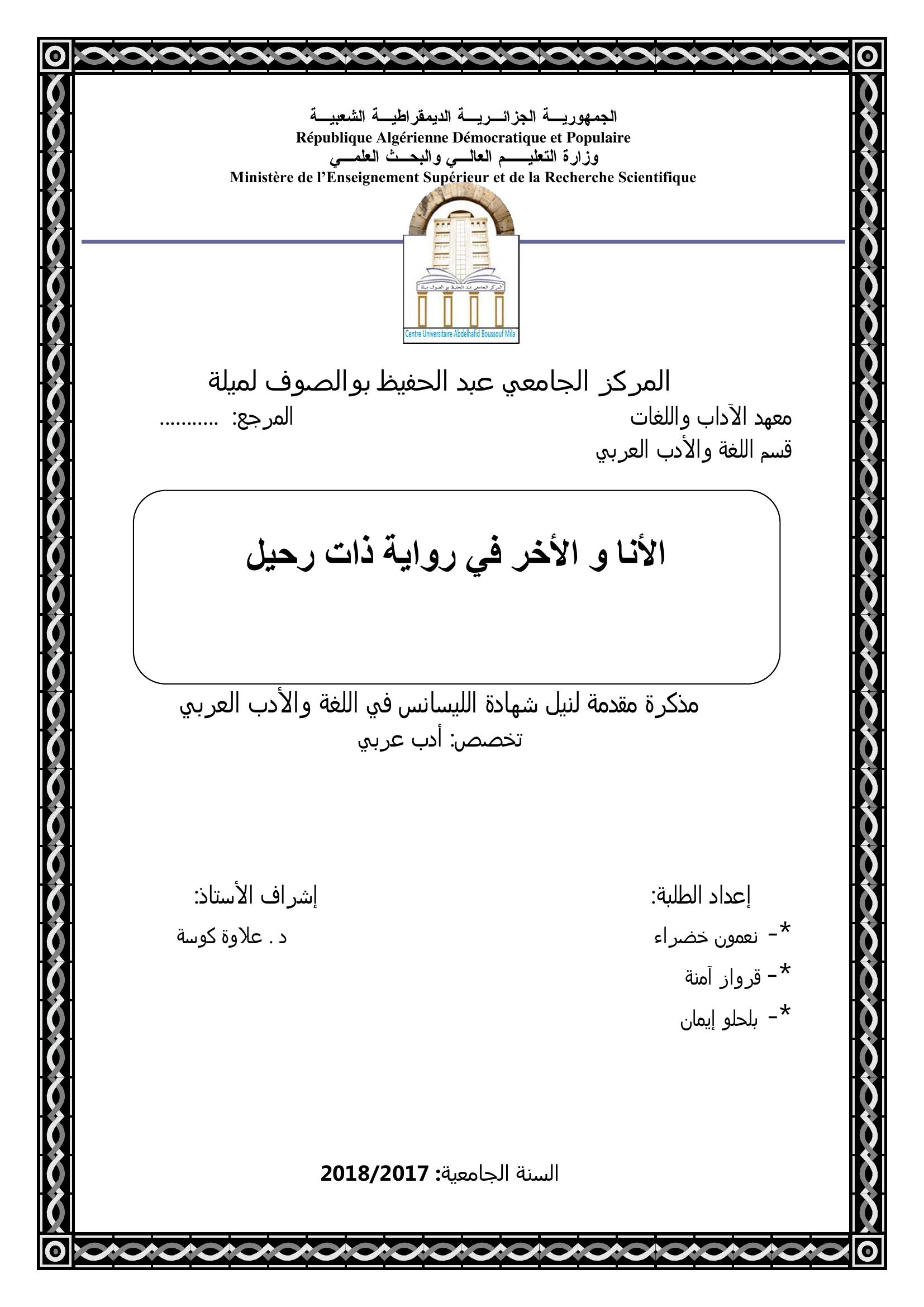 نعمون خضراء & علاوة كوسة(مشرفا) (2018). الأنا و الأخر في رواية ذات رحيل.