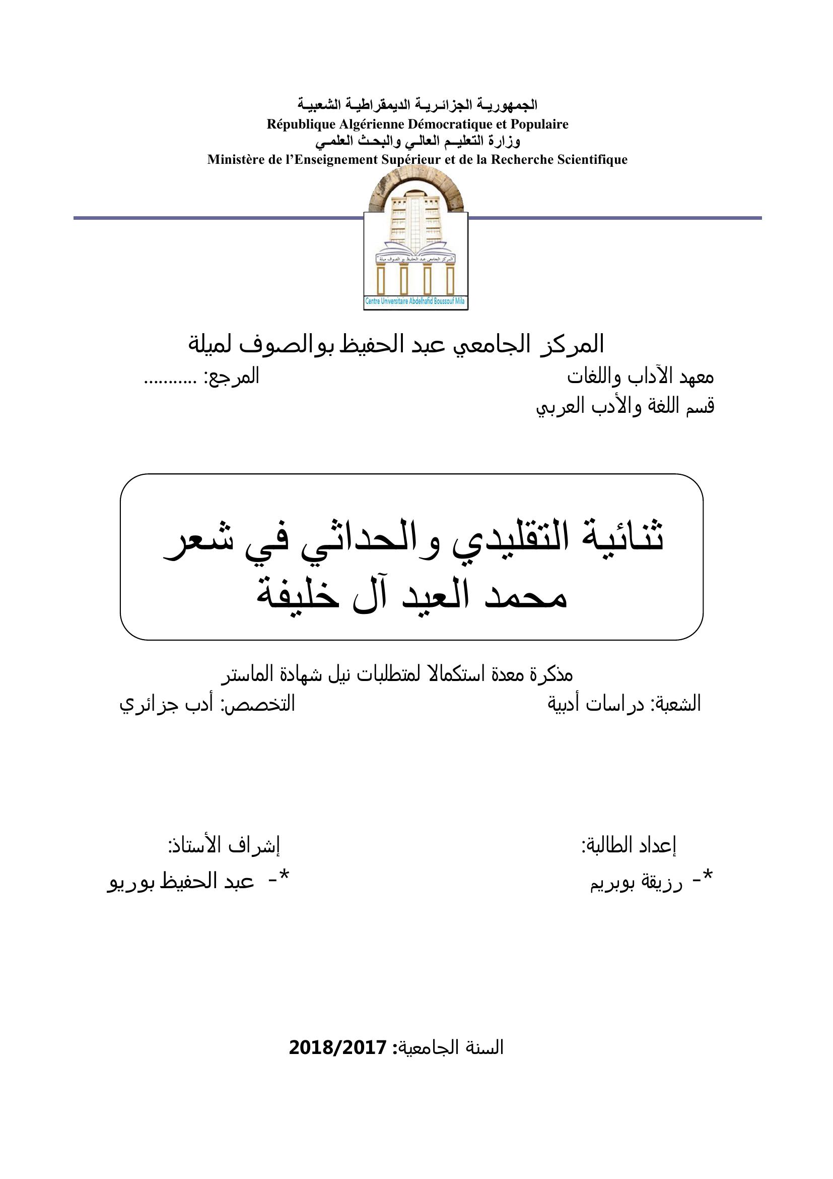 بوبريم رزيقة & بوريو عبد الحفيظ (مشرفا) (2018). ثنائية التقليدي والحداثي في شعر محمد العيد آل خليفة.