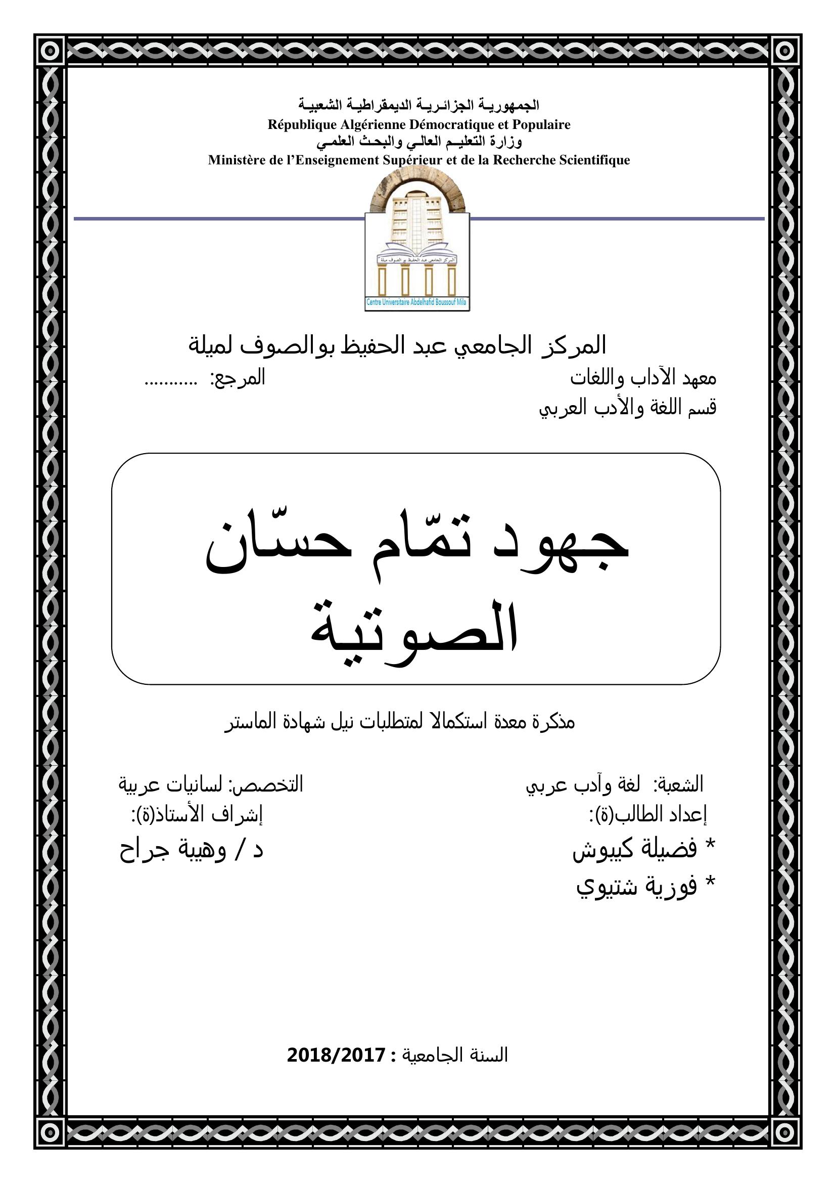 كيبوش فضيلة & جراح وهيبة (مشرفا) (2018). جهود تمام حسان الصوتية.