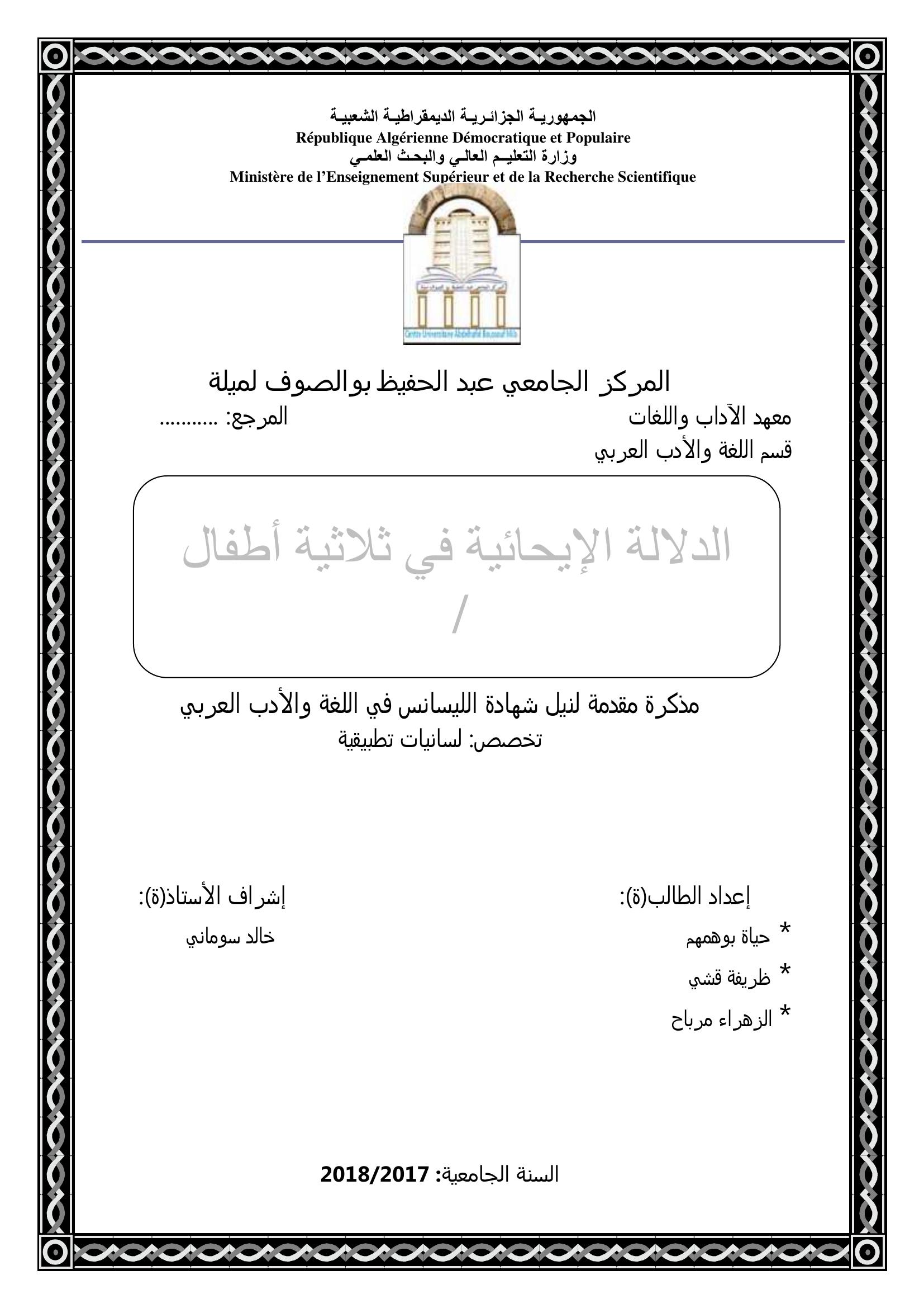 حياة بوهمهم & سوماني خالد (مشرفا) (2018). الدلالة الإيحائية في ثلاثية أطفال الحجارة ل/نزار قباني.