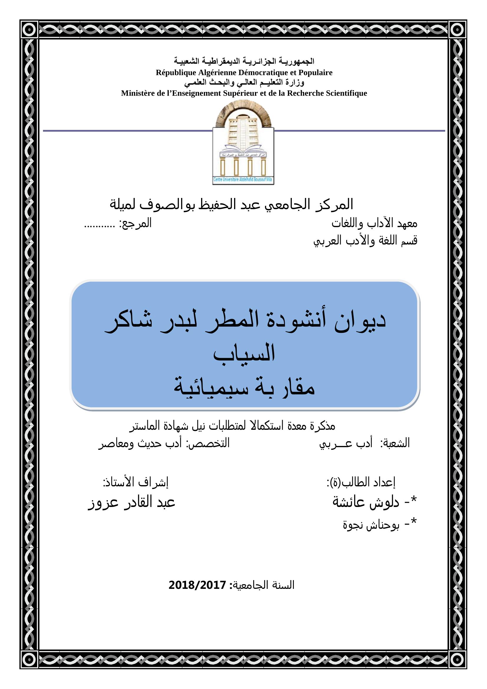 دلوش عائشة & عزوز عبد القادر (مشرفا) (2018). ديوان أنشودة المطر لبدر شاكر السياب مقاربة سيميائية.