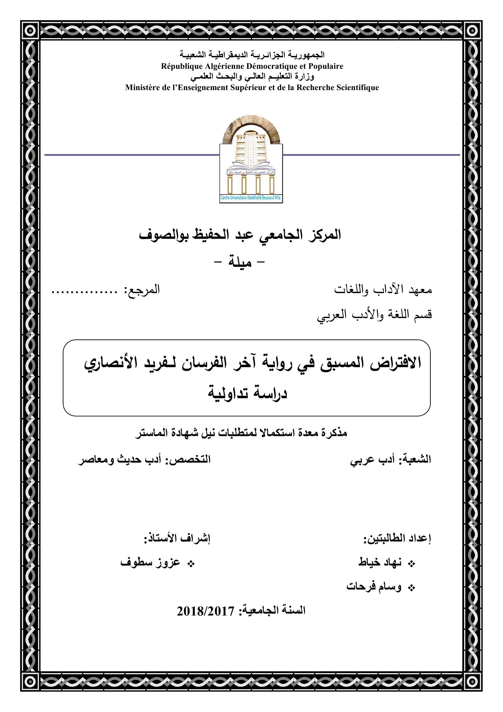 خياط نهاد & سطوف عزوز (مشرفا) (2018). الإفتراض المسبق في رواية آخر الفرسان لفريد الأنصاري دراسة تداولية.