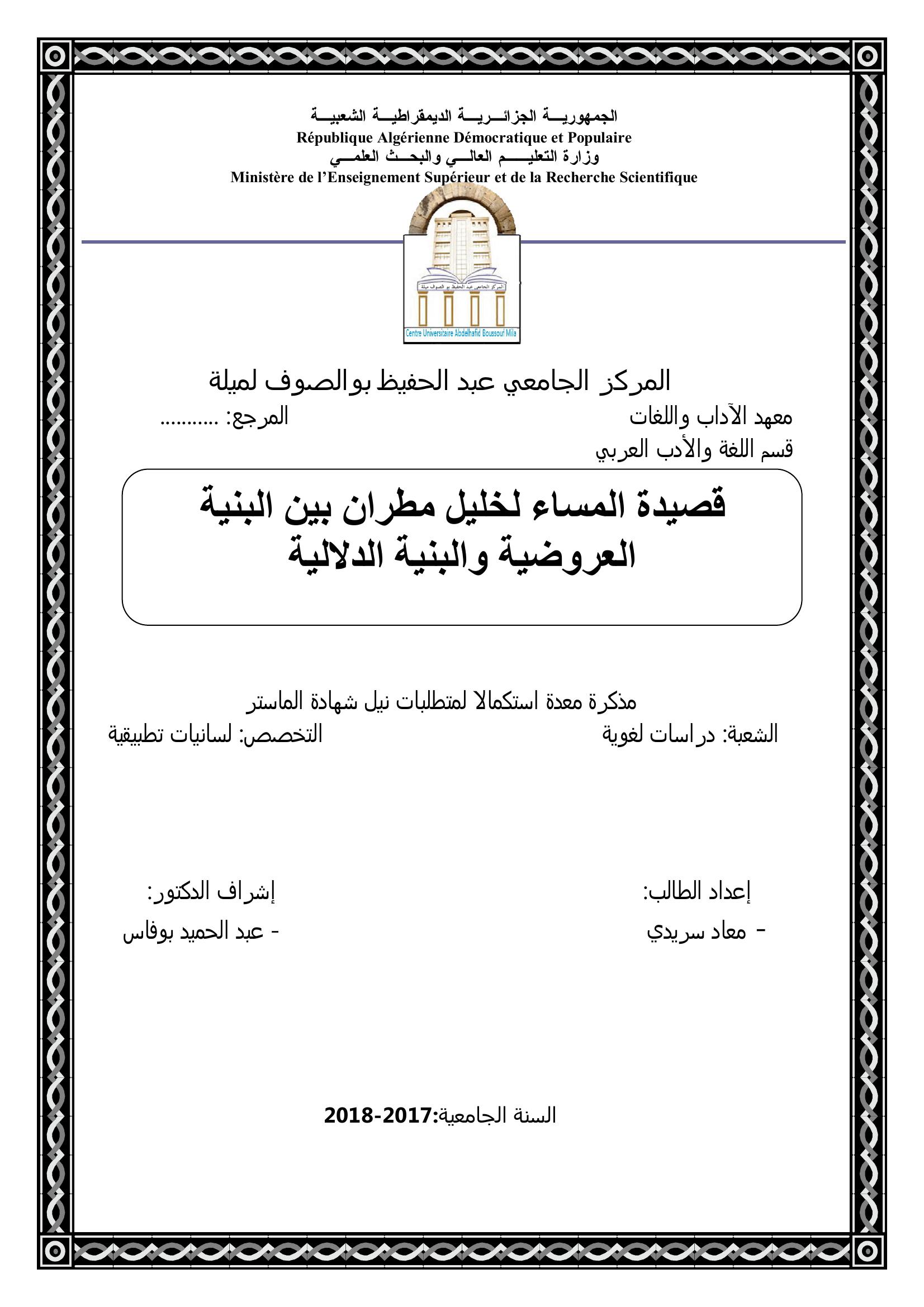 سريدي معاد & بوفاس عبد الحميد(مشرفا) (2018). قصيدة المساء لخليل مطران بين البنية العروضية والبنية الدلالية.