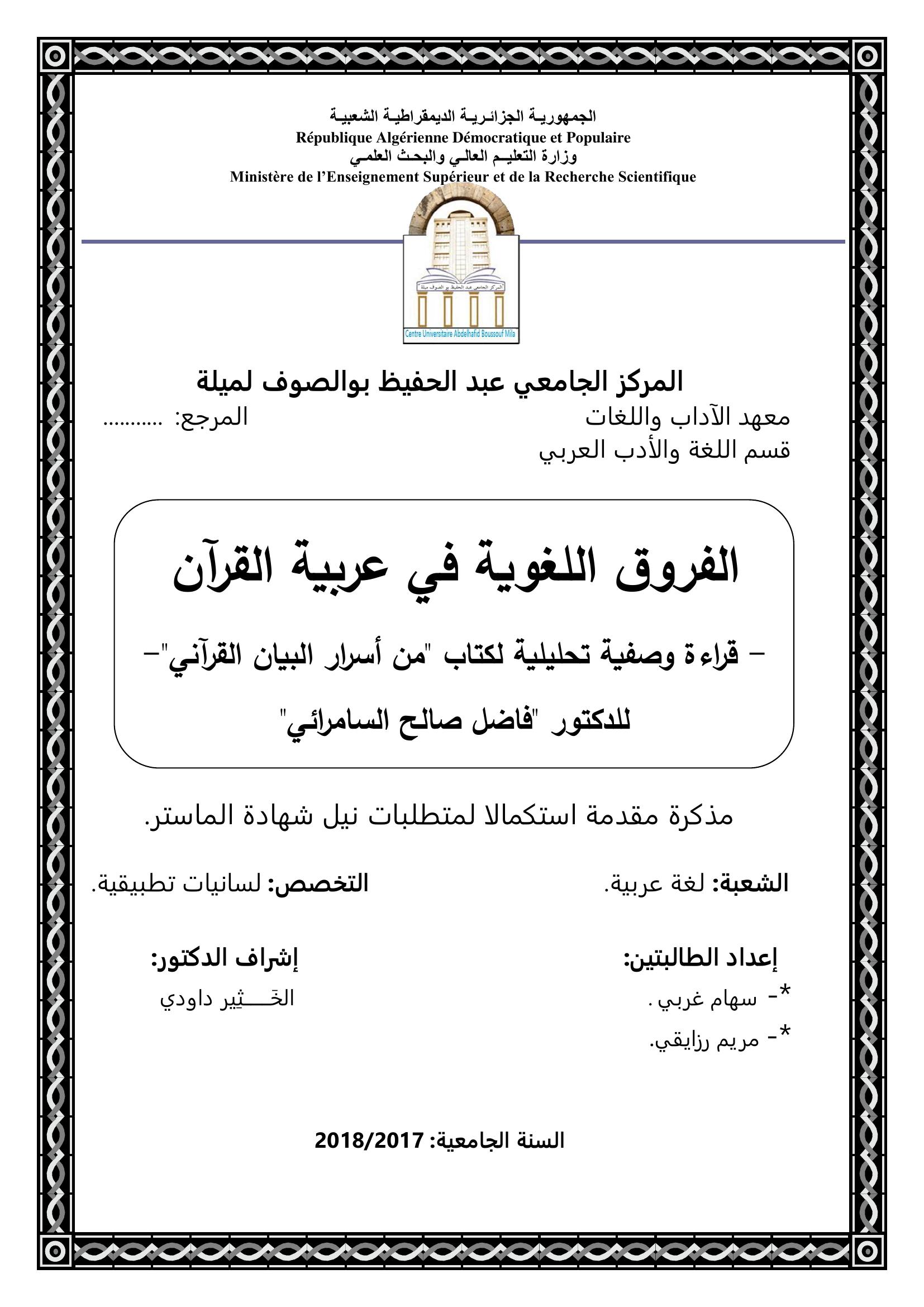 غربي سهام & داودي الخثير (مشرفا) (2018). الفروق اللغوية في عربية القرآن قراءة وصفية تحليلية لكتاب من أسرار البيان القرآني للدكتور فاضل صالح السامرائي.