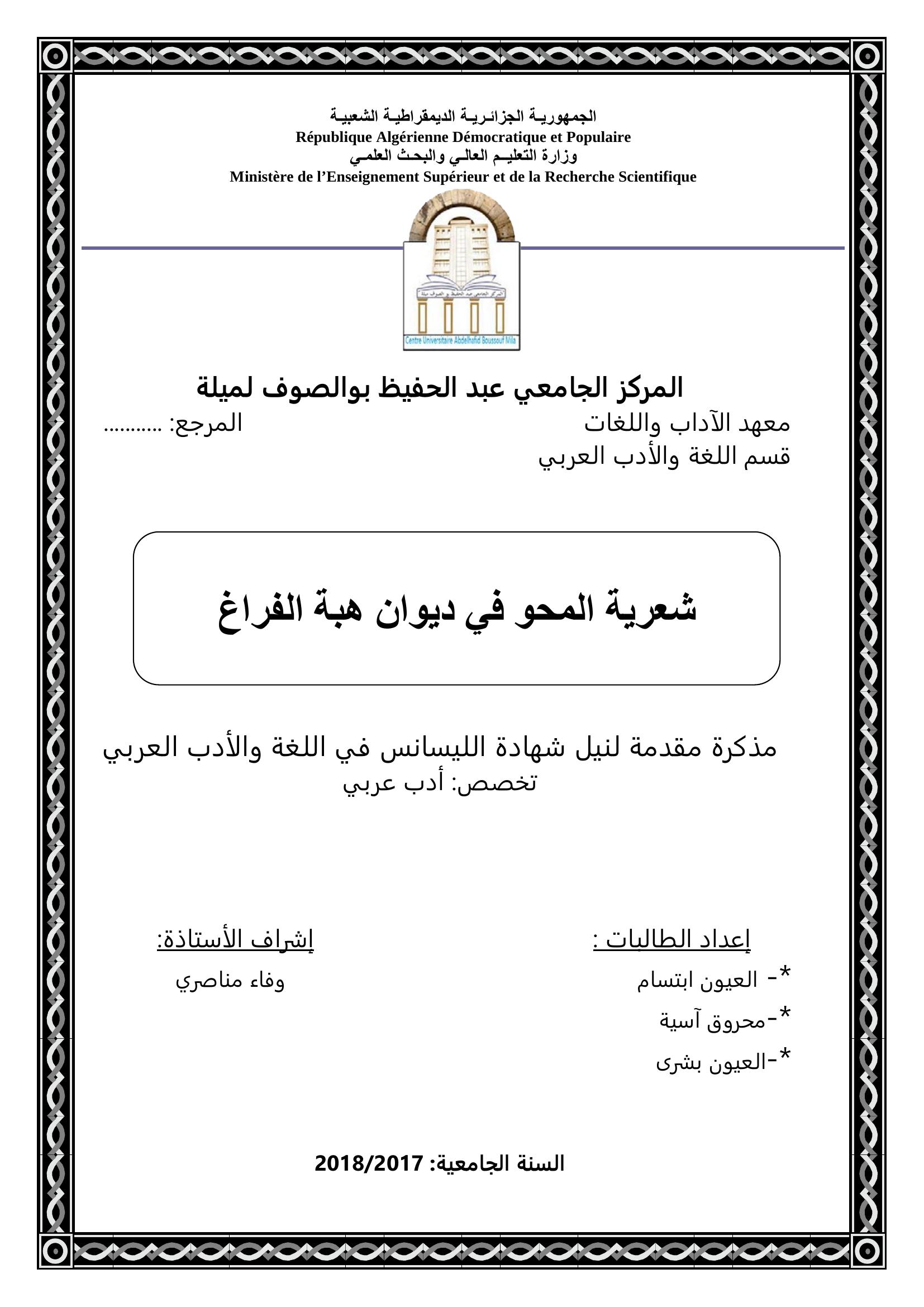 العيون ابتسام & مناصري وفاء (مشرفا) (2018). شعرية المحو في ديوان هبة الفراغ.