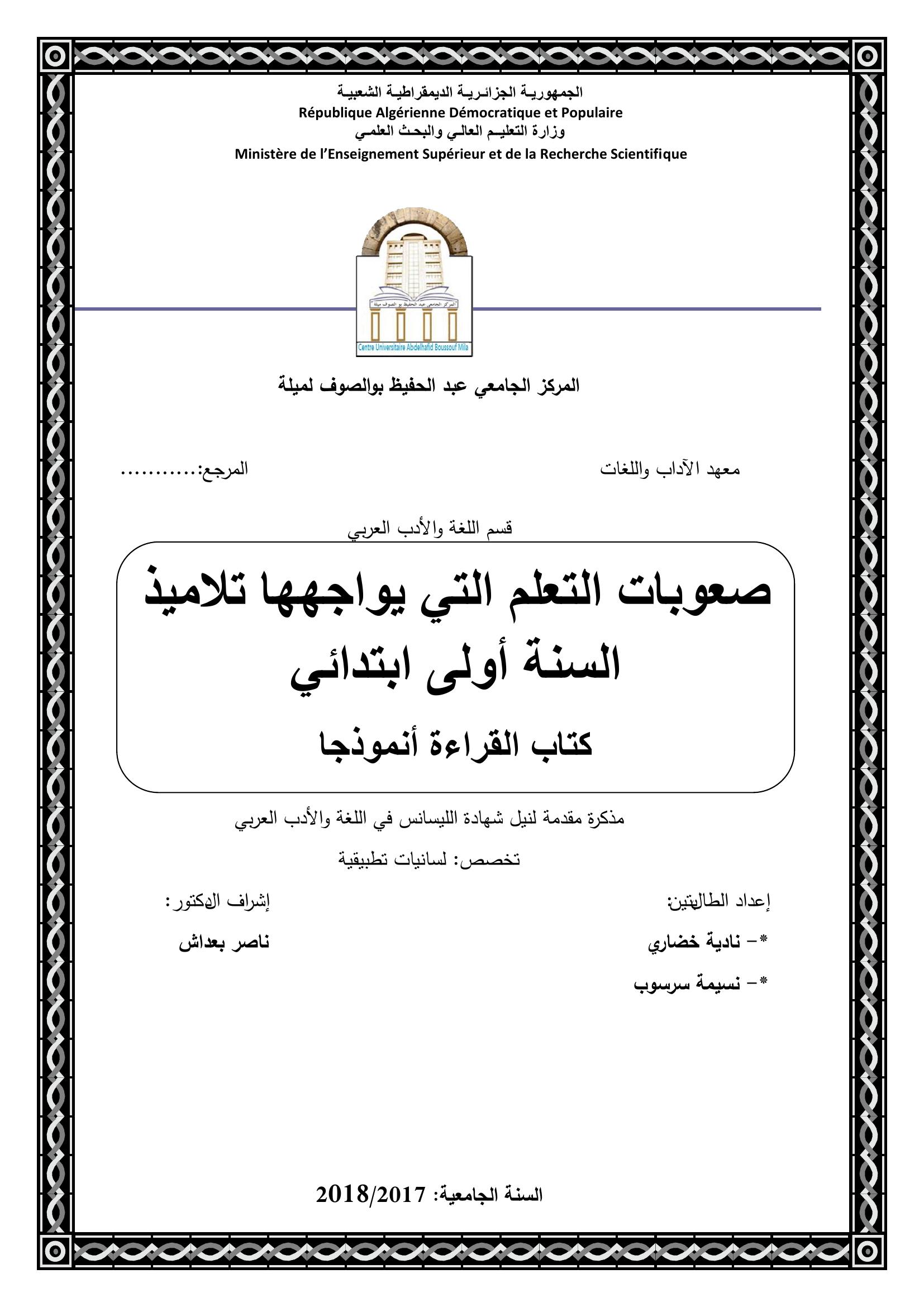 نادية خضاري & بعداش ناصر (مشرفا) (2018). صعوبات التعلم التي يواجهها تلاميذ السنة أولى إبتدائي : كتاب القراءة أ نمودجا.