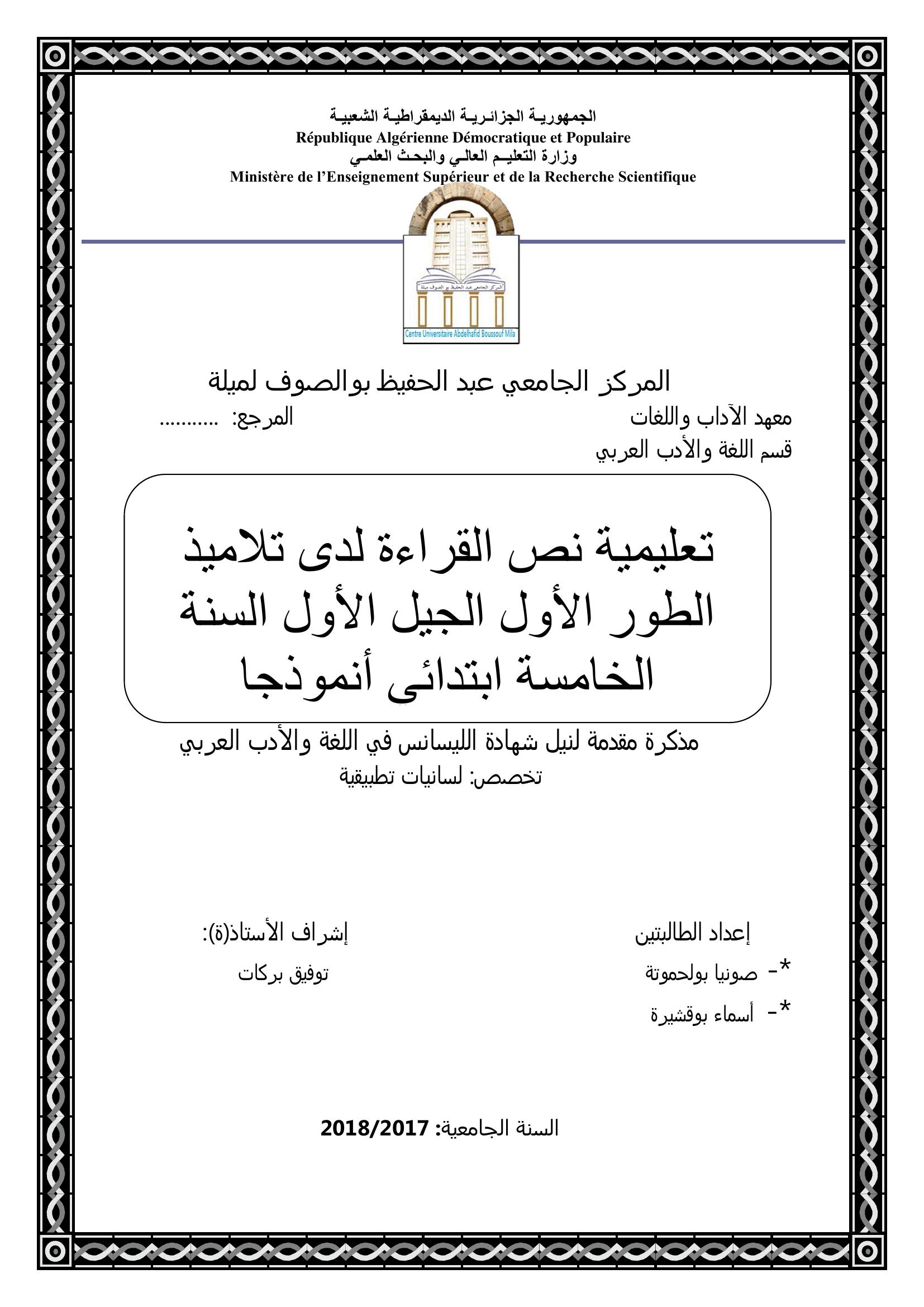 صونيا بولحموتة & بركات توفيق (مشرفا) (2018). تعليمية نص القراءة لدى تلاميذ الطور الأول الجيل الأول السنة الخامسة ابتدائي أنموذجا.