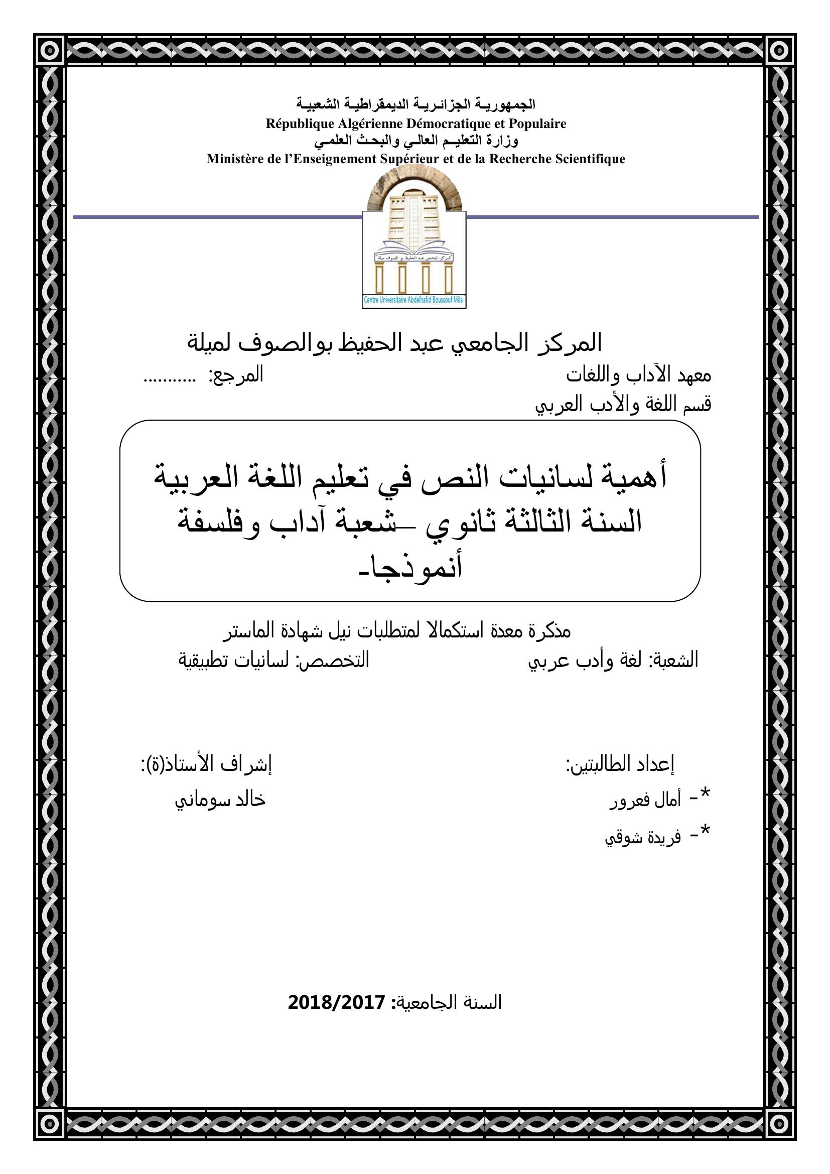 فعرور أمال & سوماني خالد (مشرفا) (2018). أهمية لسانيات النص في تعليم اللغة العربية السنة الثالثة ثانوي شعبة آداب وفلسفة أنموذجا.