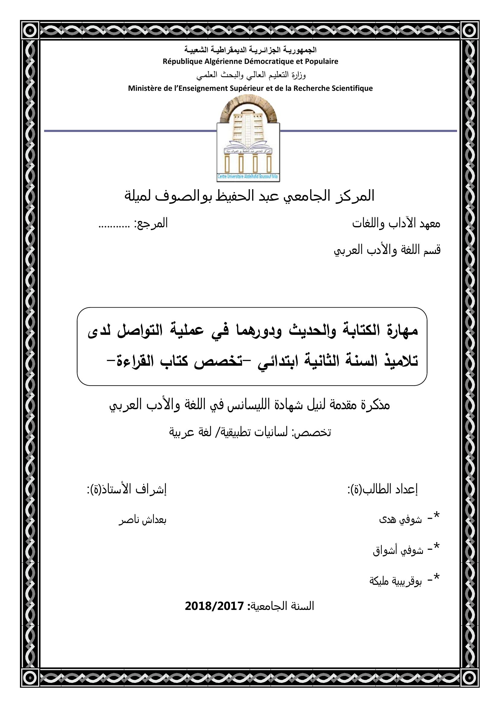 شوفي هدى & بعداش ناصر (مشرفا) (2018). مهارة الكتابة والحديث ودورهما في عملية التواصل لدى تلاميذ السنة الثانية ابتدائي -تخصص كتاب القراءة-.