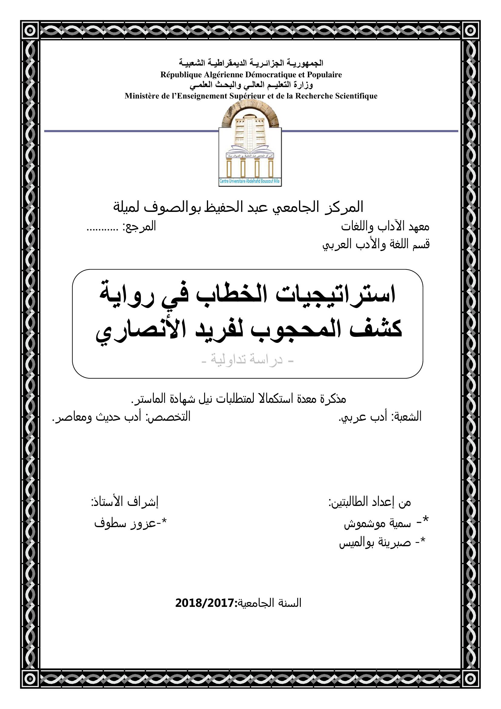 موشموش سمية & سطوف عزوز (مشرفا) (2018). إستراتيجيات الخطاب في رواية كشف المحجوب لفريد الأنصاري.
