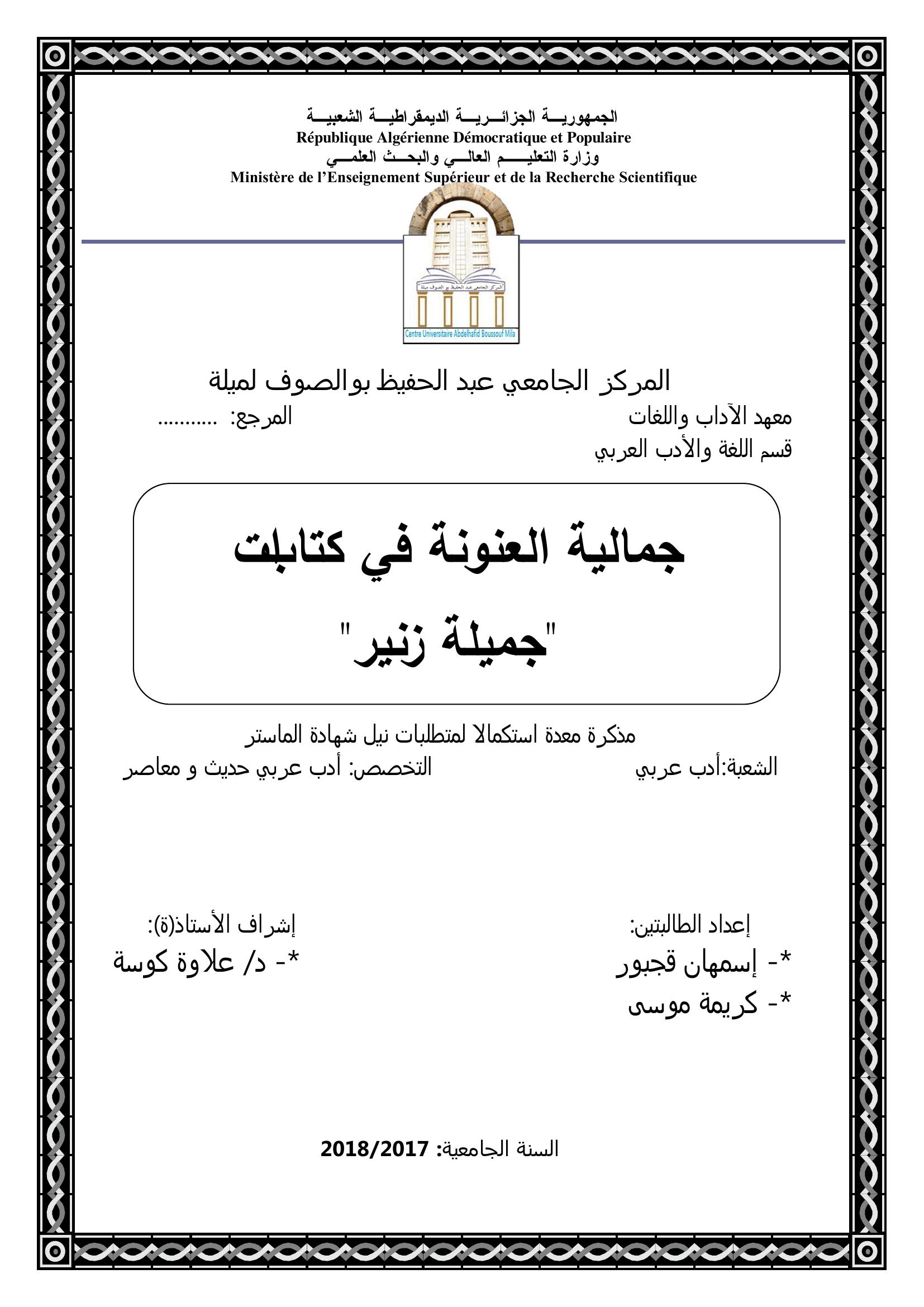 قجبور إسمهان & علاوة كوسة(مشرفا) (2018). جمالية العنونة في كتابات جميلة زنير.