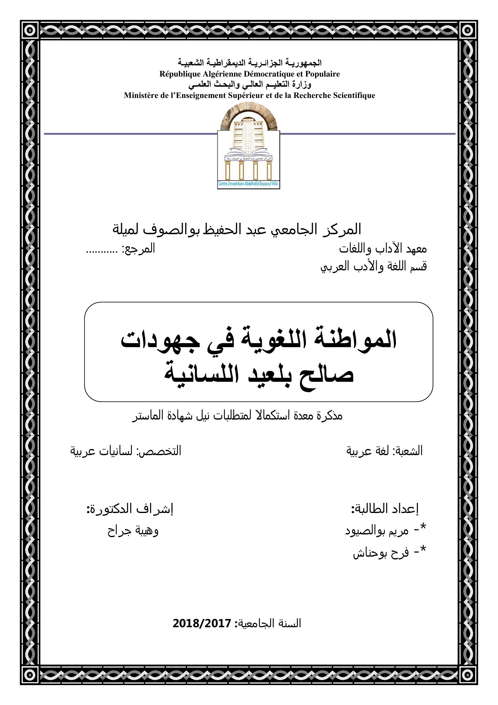 بوالصيود مريم & جراح وهيبة (مشرفا) (2018). المواطنة اللغوية في جهودات صالح بلعيد اللسانية.