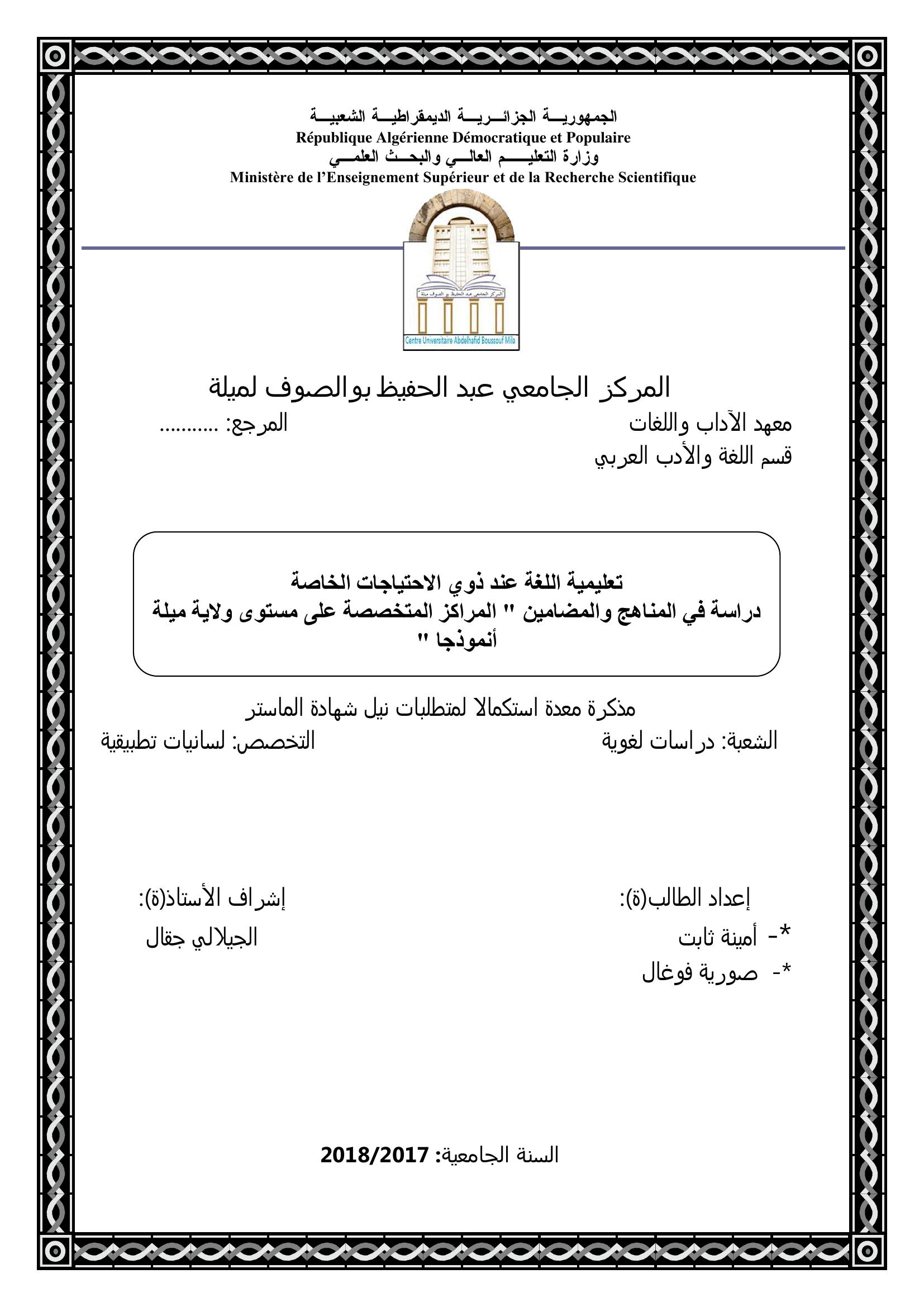 ثابث أمينة & جقال الجيلالي (مشرفا) (2018). تعليمية اللغة عند ذوي الإحتياجات الخاصة دراسة في المناهج والمضامين المراكز المتخصصة على مستوى ولاية ميلة أنموذجا.