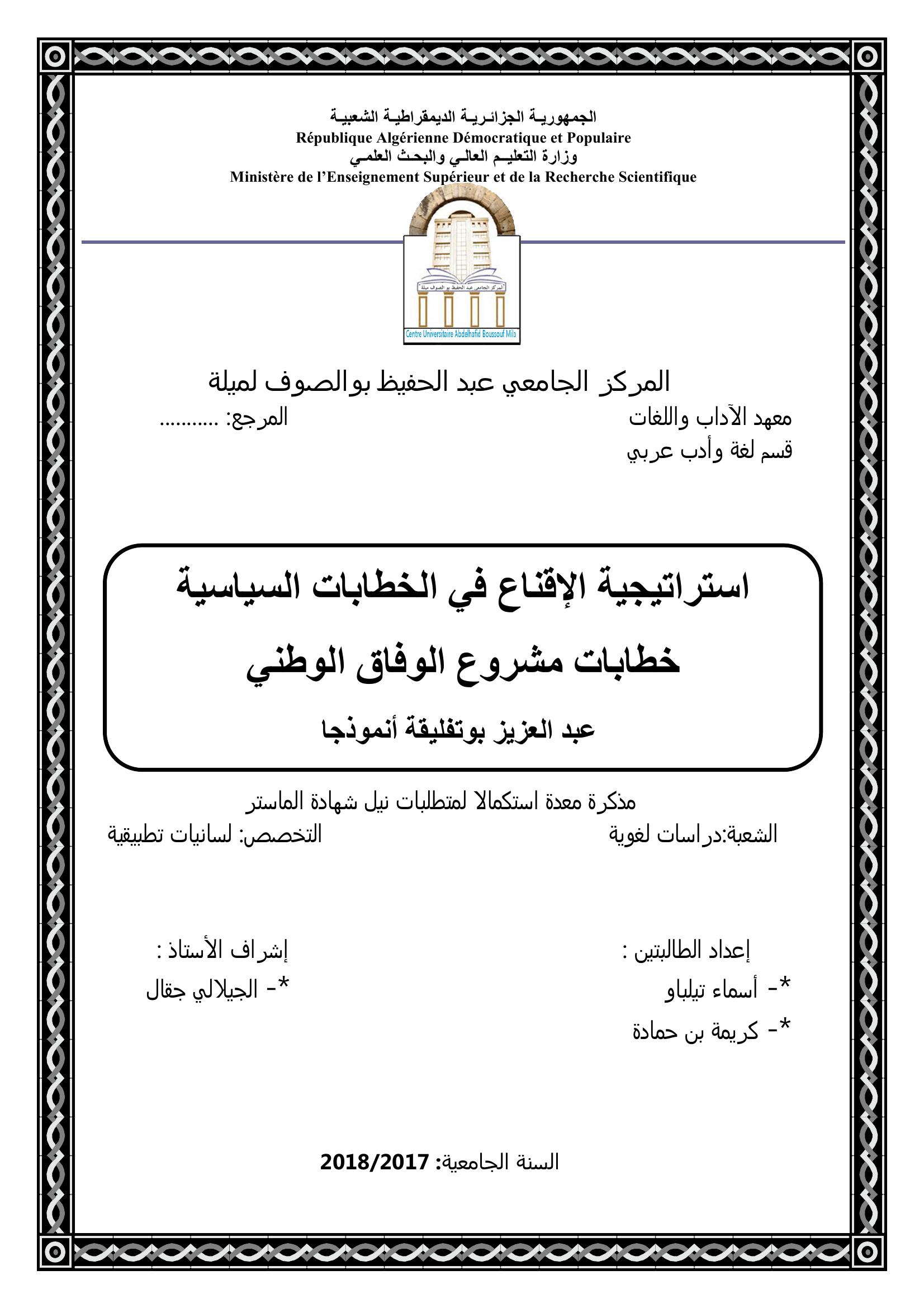 تيلباو أسماء & جقال الجيلالي (مشرفا) (2018). إستراتيجية الإقناع في الخطابات السياسية خطابات مشروع الوفاق الوطني عبد العزيز بوتفليقة أنموذجا.