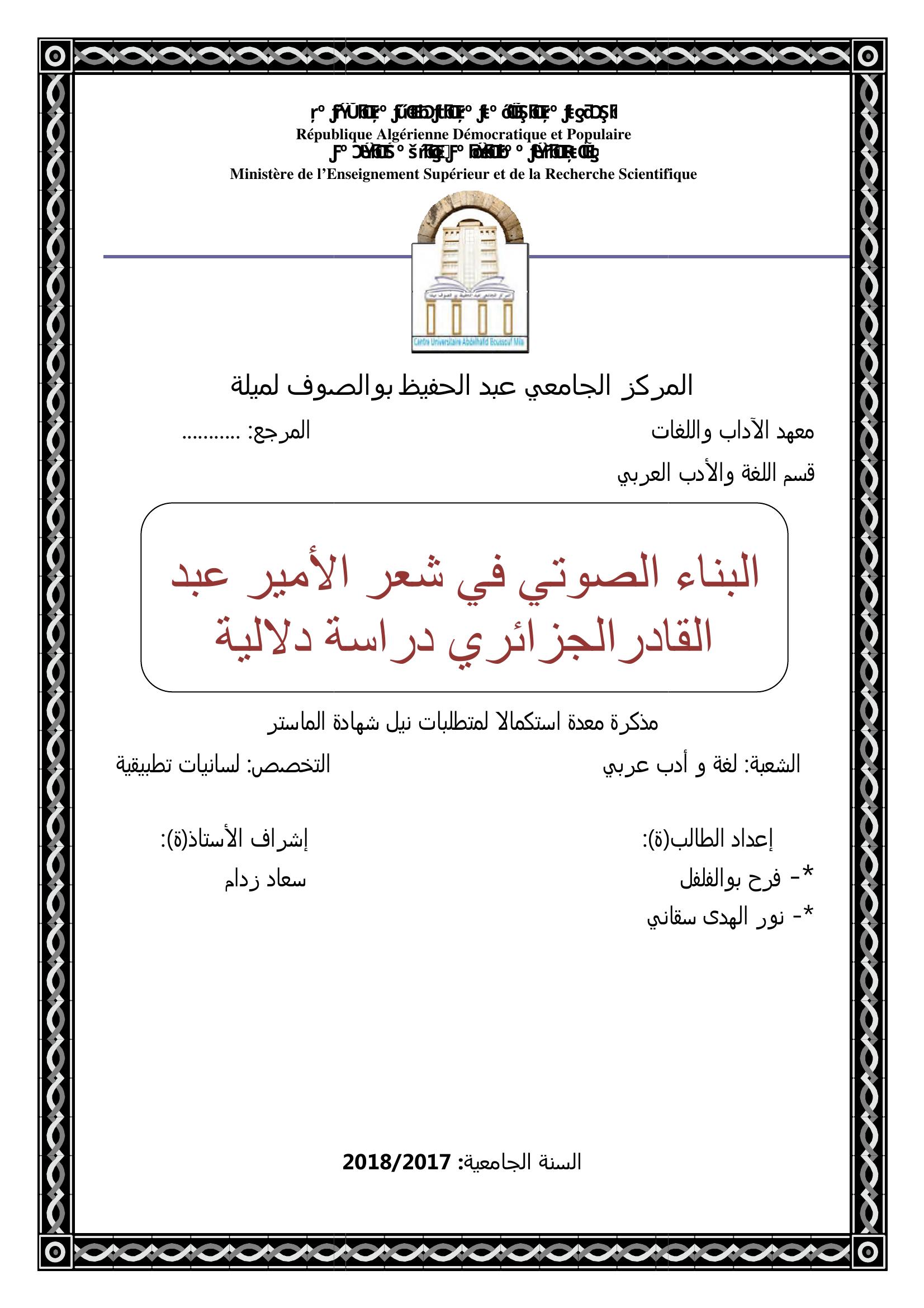بوالفلفل فرح & زدام سعاد (مشرفا) (2018). البناء الصوتي في شعر الأمير عبد القادر الجزائري دراسة دلالية.