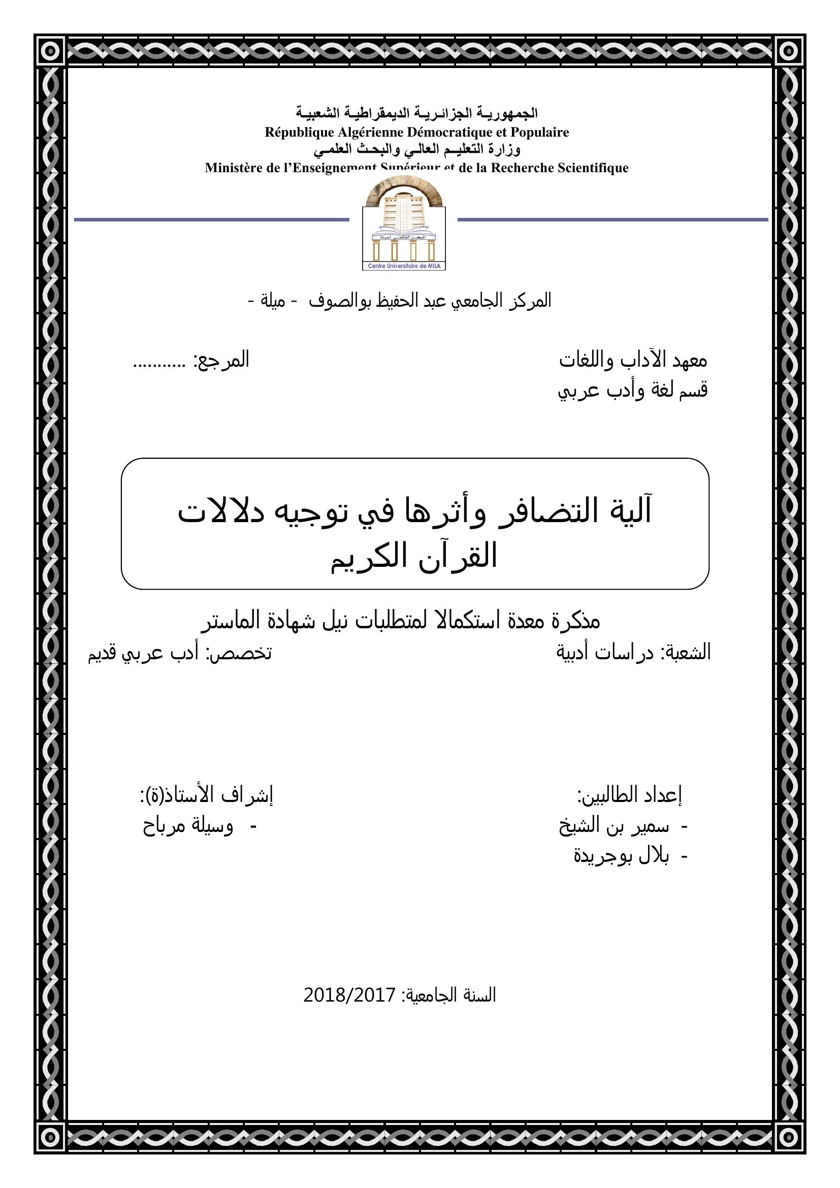 بن الشيخ سمير & مرباح وسيلة (مشرفا) (2018). آلية التضافر وأثرها في توجيه دلالات القرآن الكريم.