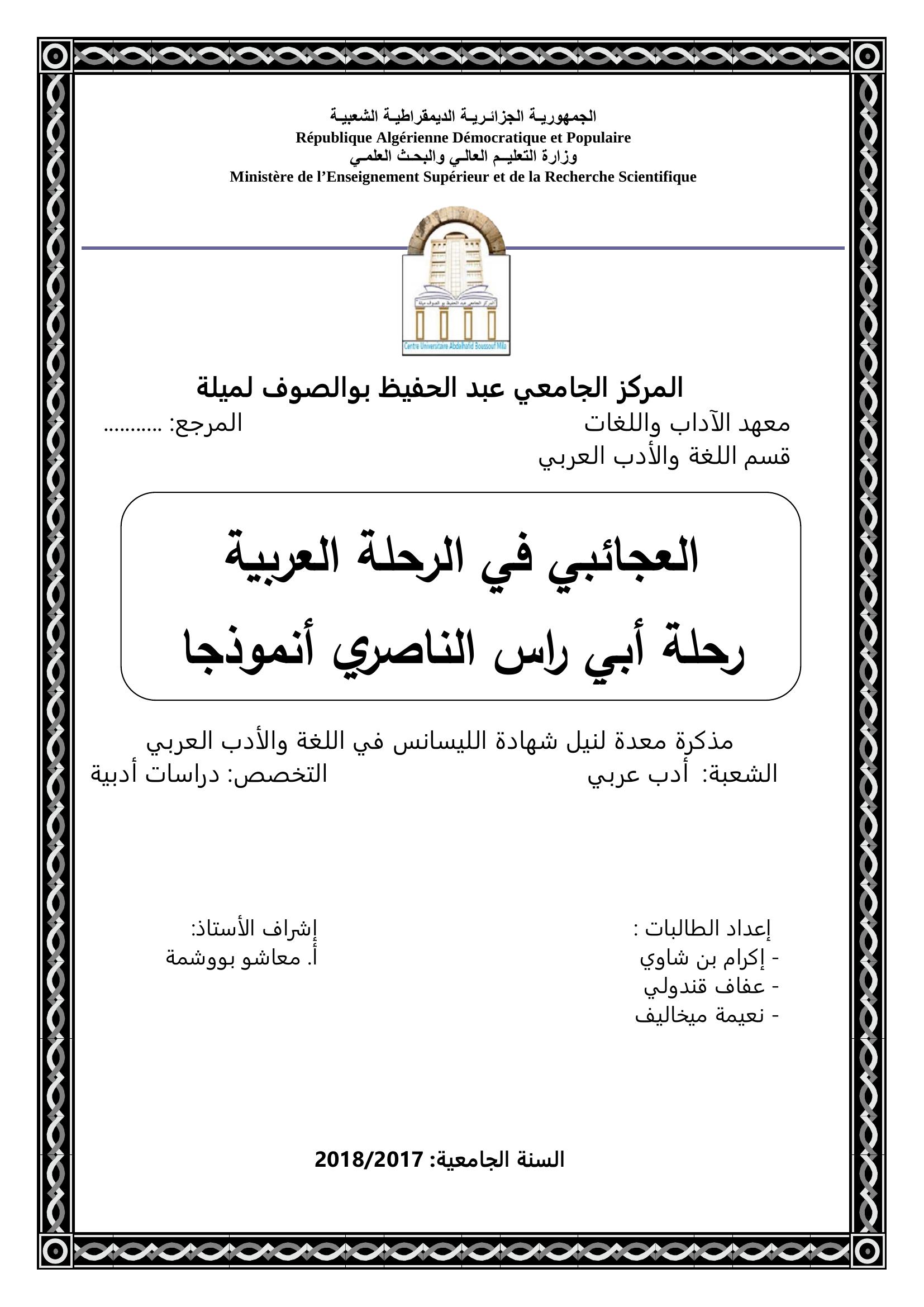 بن شاوي إكرام & معاشوبووشمة (مشرفا) (2018). العجائبي في الرحلة العربية : رحلة أبي راس الناصري أنموذجا.