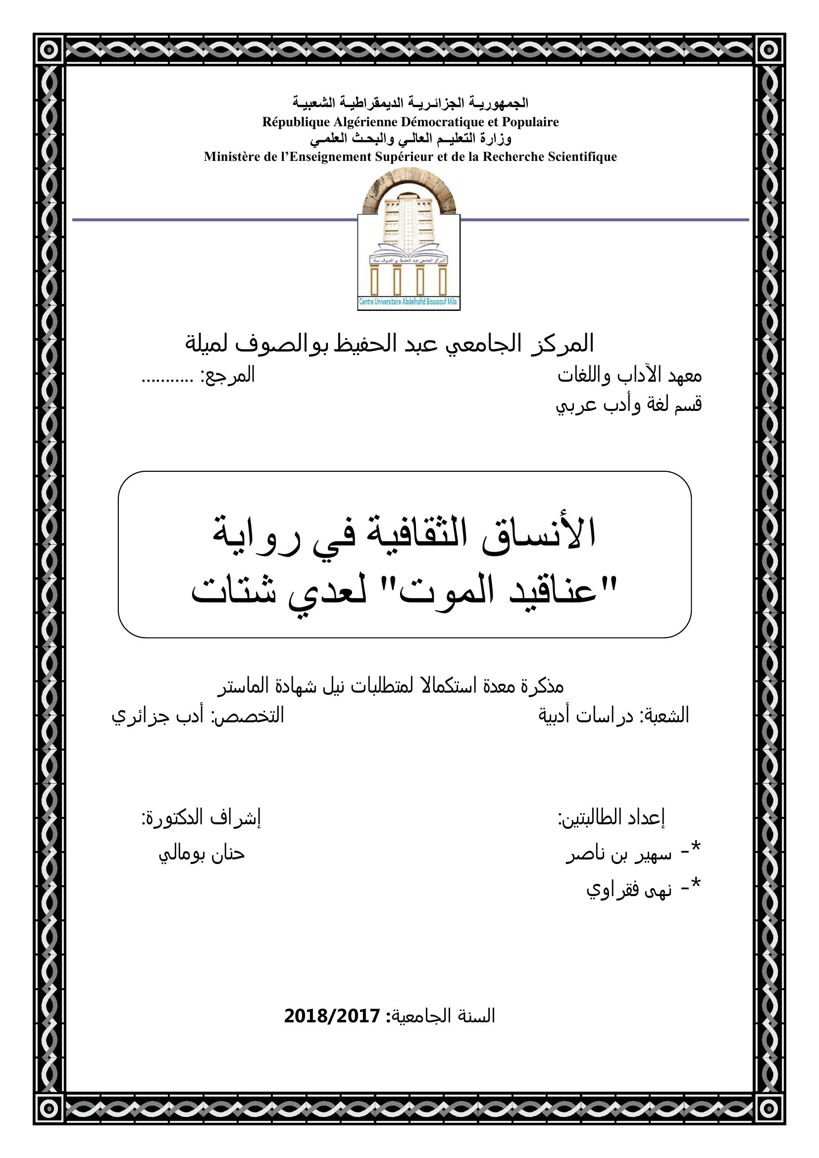 بن ناصر سهير & بومالي حنان (2018). الأنساق الثقافية في رواية عناقيد الموت لعدي شتات.