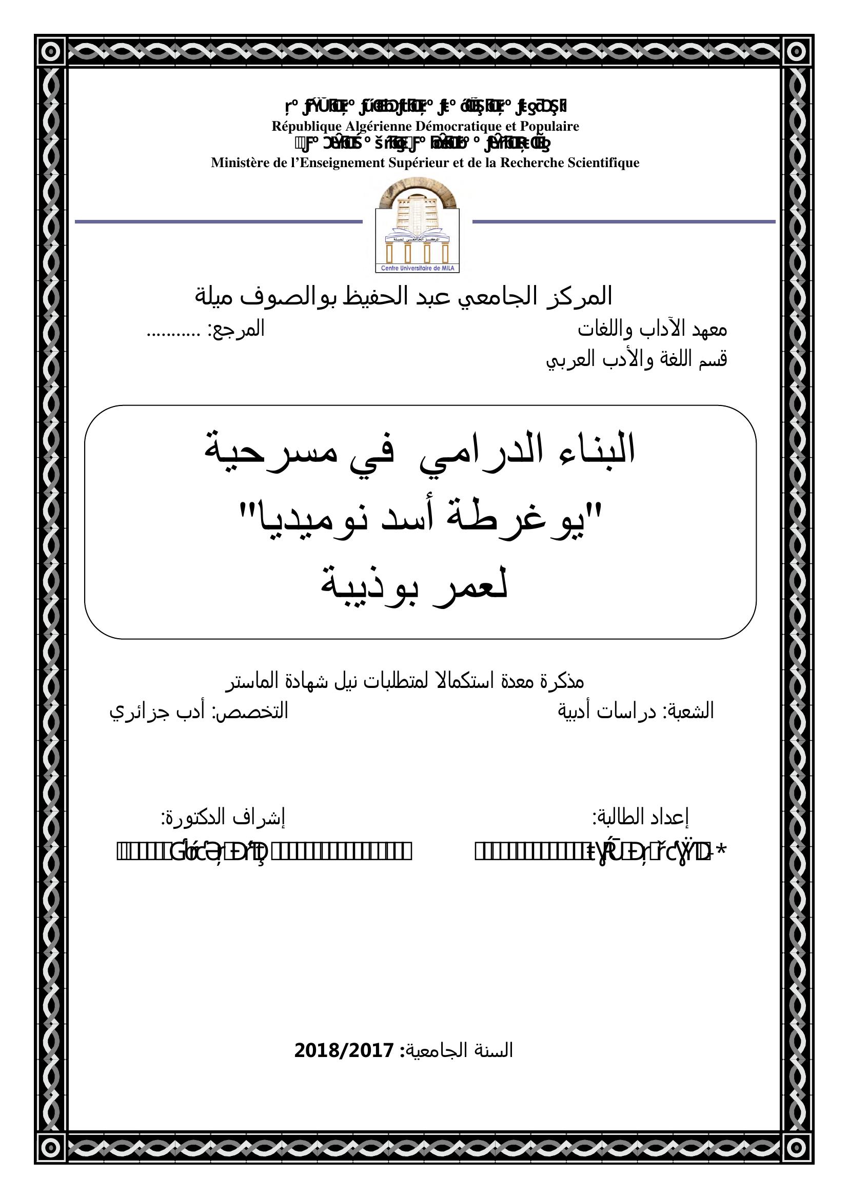 بن زايد نعيمة & بومالي حنان (2018). البناء الدرامي في مسرحية يوغرطة أسد نوميديا لعمر بوذيبة.