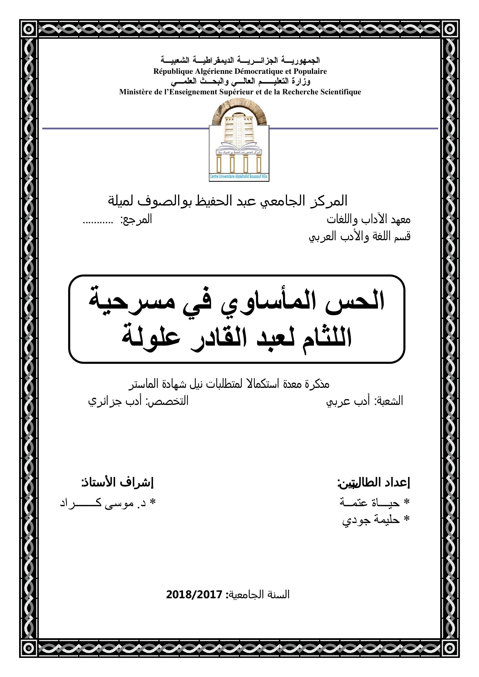 عتمة حياة & كراد موسى (مشرفا) (2018). الحس المأساوي في مسرحية اللئام عبد القادر علولة.