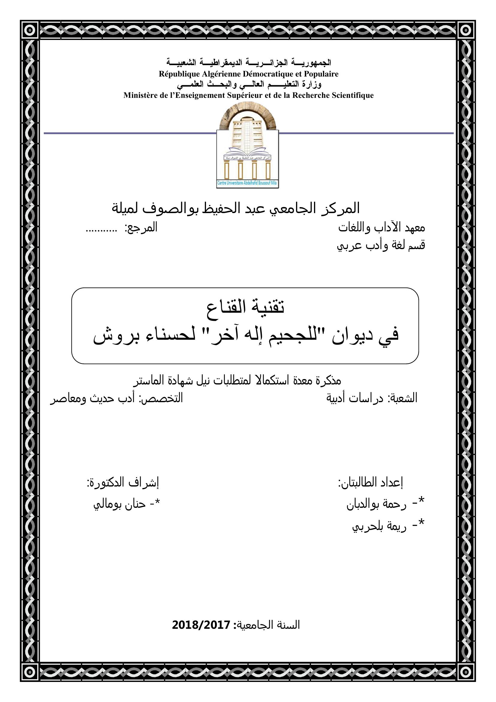 بوالدبان رحمة & بومالي حنان (2018). تقنية القناع في ديوان للجحيم إله آخر لحسناء بروش.