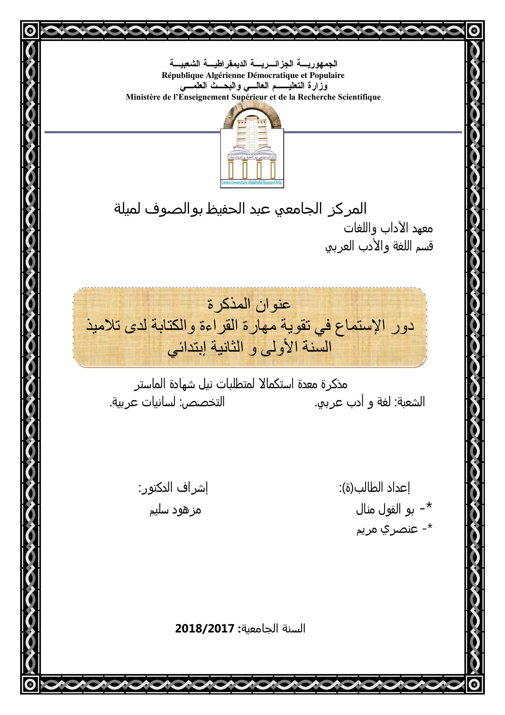 بوالفول منال & مزهود سليم (مشرفا) (2018). دور الإستماع في تقوية مهارة القراءة والكتابة لدى تلاميذ السنة الأولى والثانية إبتدائي.