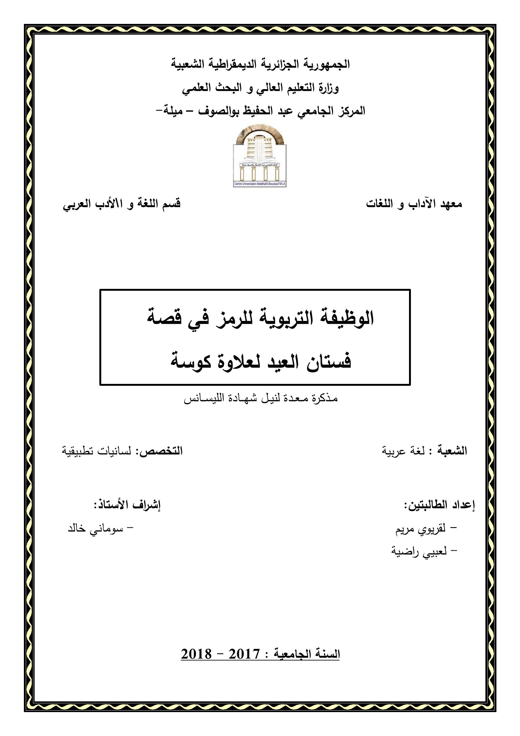 لقريوي مريم & سوماني خالد (مشرفا) (2018). الوظيفة التربوية للرمز في قصة فستان العيد لعلاوة كوسة.