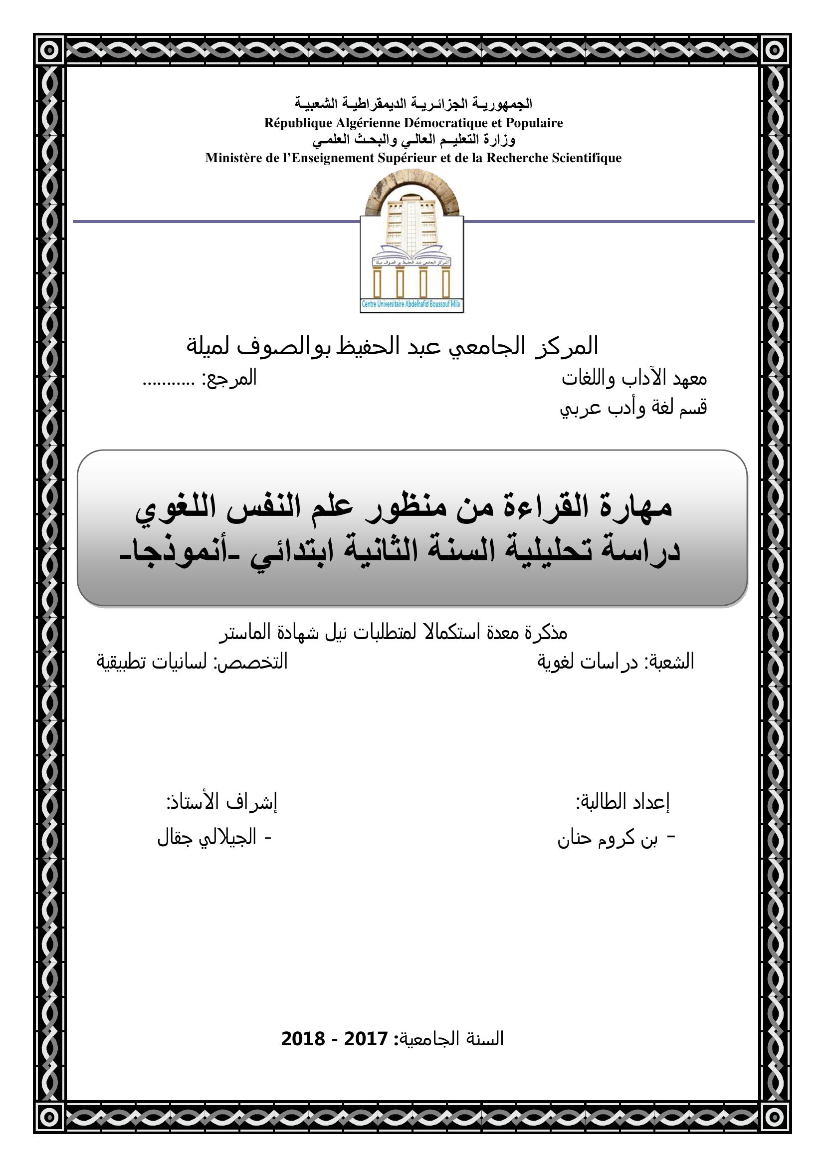 بن كروم حنان & جقال الجيلالي (مشرفا) (2018). مهارة القراءة من منظور علم النفس اللغوي دراسة تحليلية السنة الثانية إبتدائي.