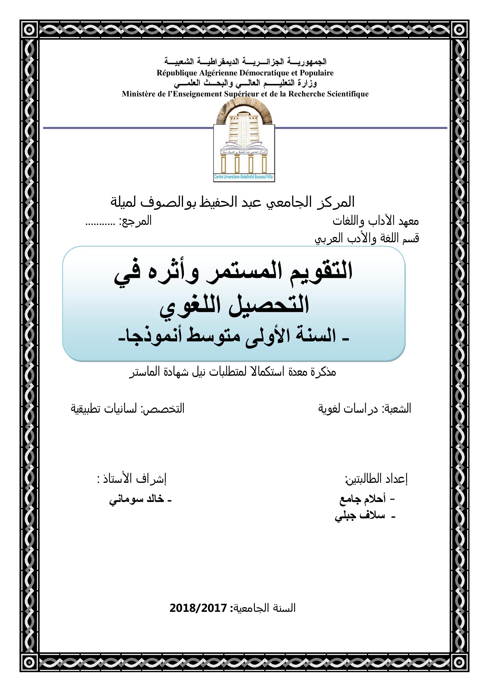 جامع أحلام & سوماني خالد (مشرفا) (2018). التقويم المستمر وأثره في التحصيل اللغوي السنة الأولى متوسط أنموذجا.