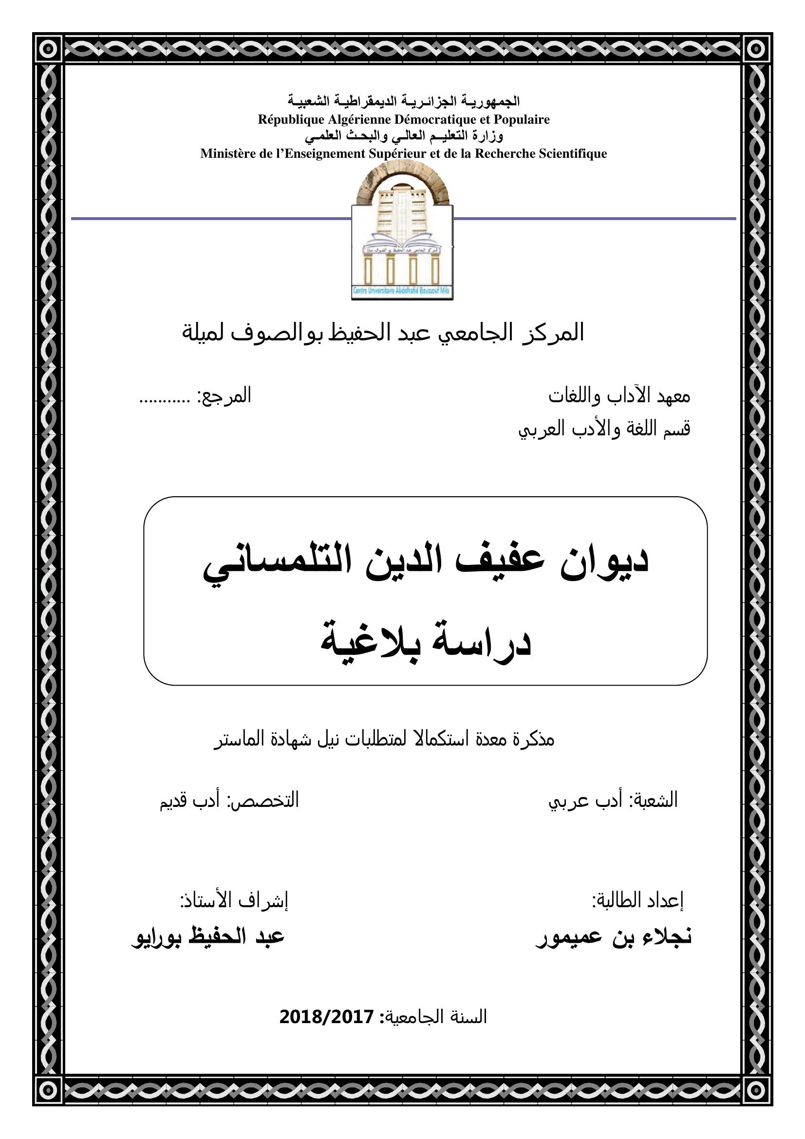 بن عميمور نجلاء & بورايو عبد الحفيظ (مشرفا) (2018). ديوان عفيف الدين التلمساني دراسة بلاغية.