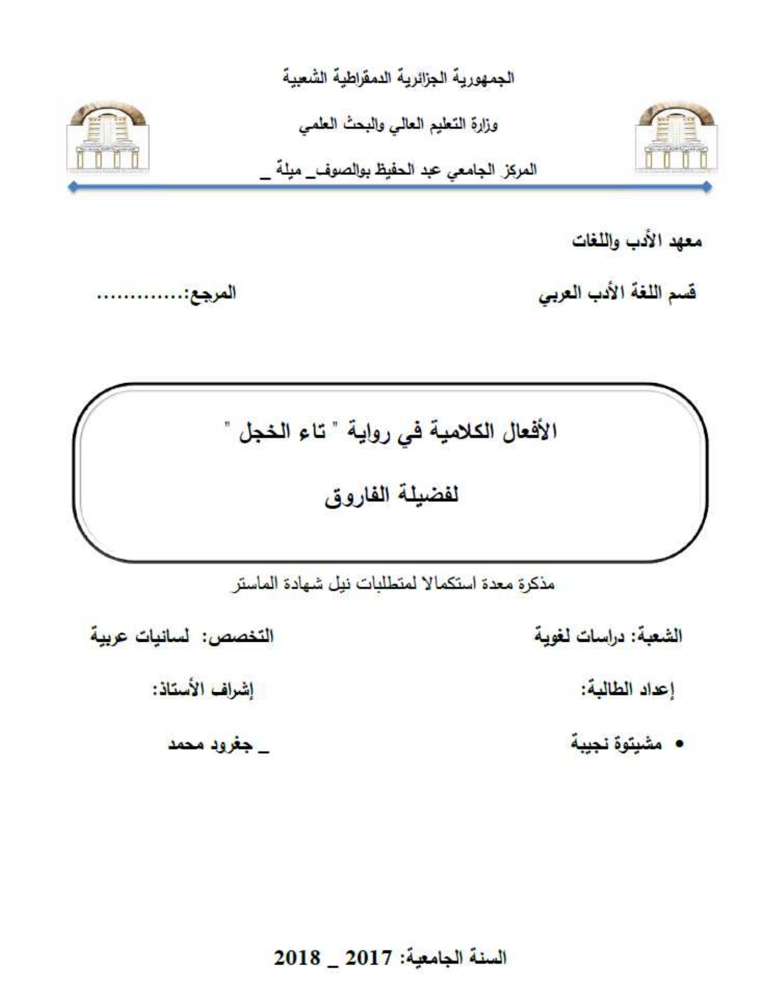 مشيتوة نجيبة & جغرود محمد (مشرفا) (2018). الأفعال الكلامية في رواية تاء الخجل لفضيلة الفاروق.