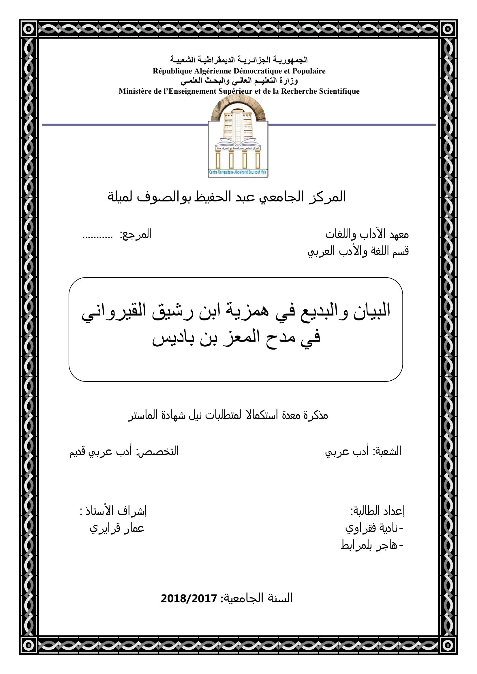 فقراوي نادية & قرايري عمار (مشرفا) (2018). البيان والبديع في همزية إبن رشيق القيرواني في مدح المعز بن باديس.