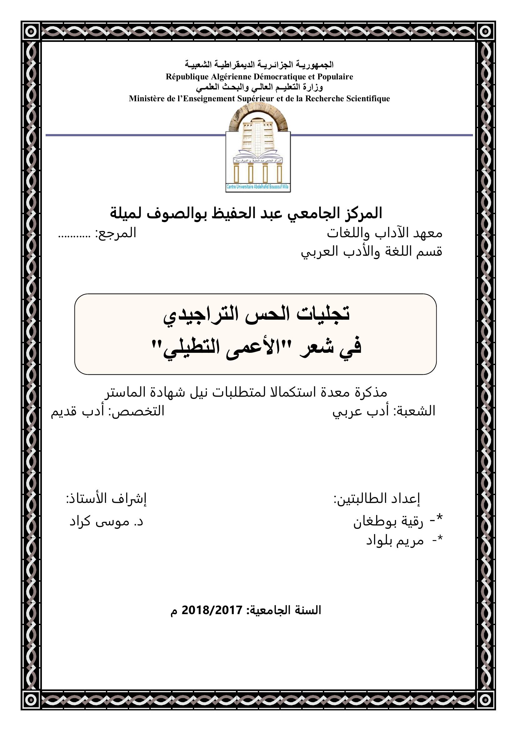 بوطغان رقية & كراد موسى (مشرفا) (2018). تجليات الحس التراجيدي في شعر الأعمى التطيلي.