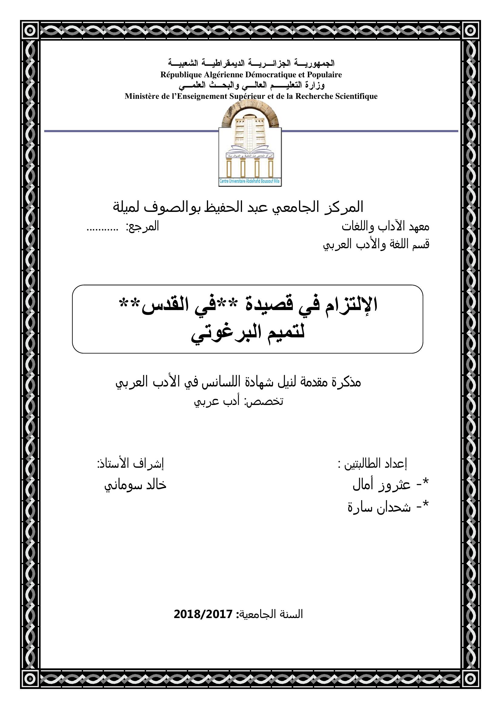 عثروز أمال & سوماني خالد (مشرفا) (2018). الإلتزام في قصيدة **في القدس** لتوين البرغوتي.