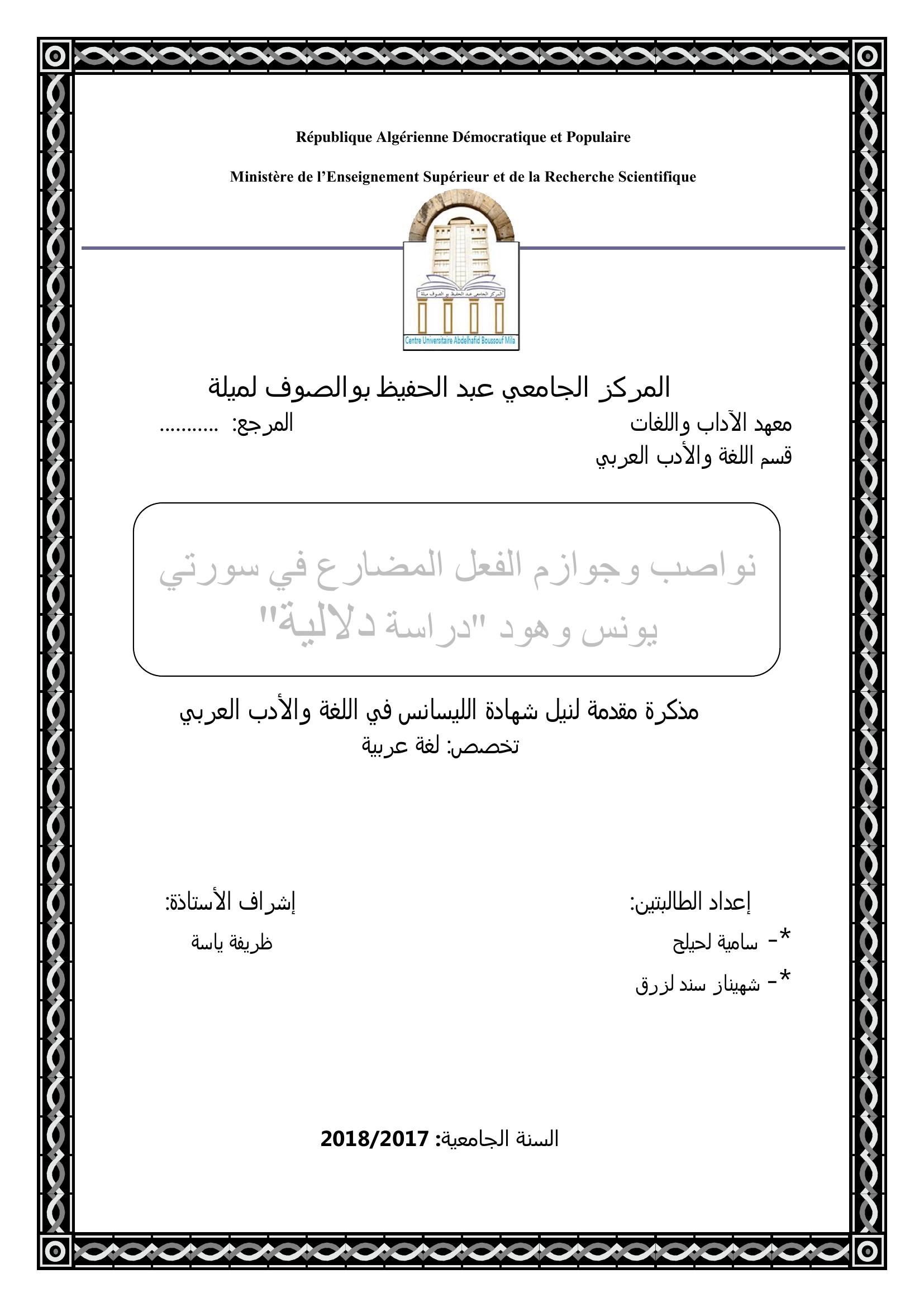 لحيلح سامية & ياسة ظريفة (مشرفا) (2018). نواصب وجوازم الفعل المضارع في سورتي يونس وهود "دراسة دلالية".